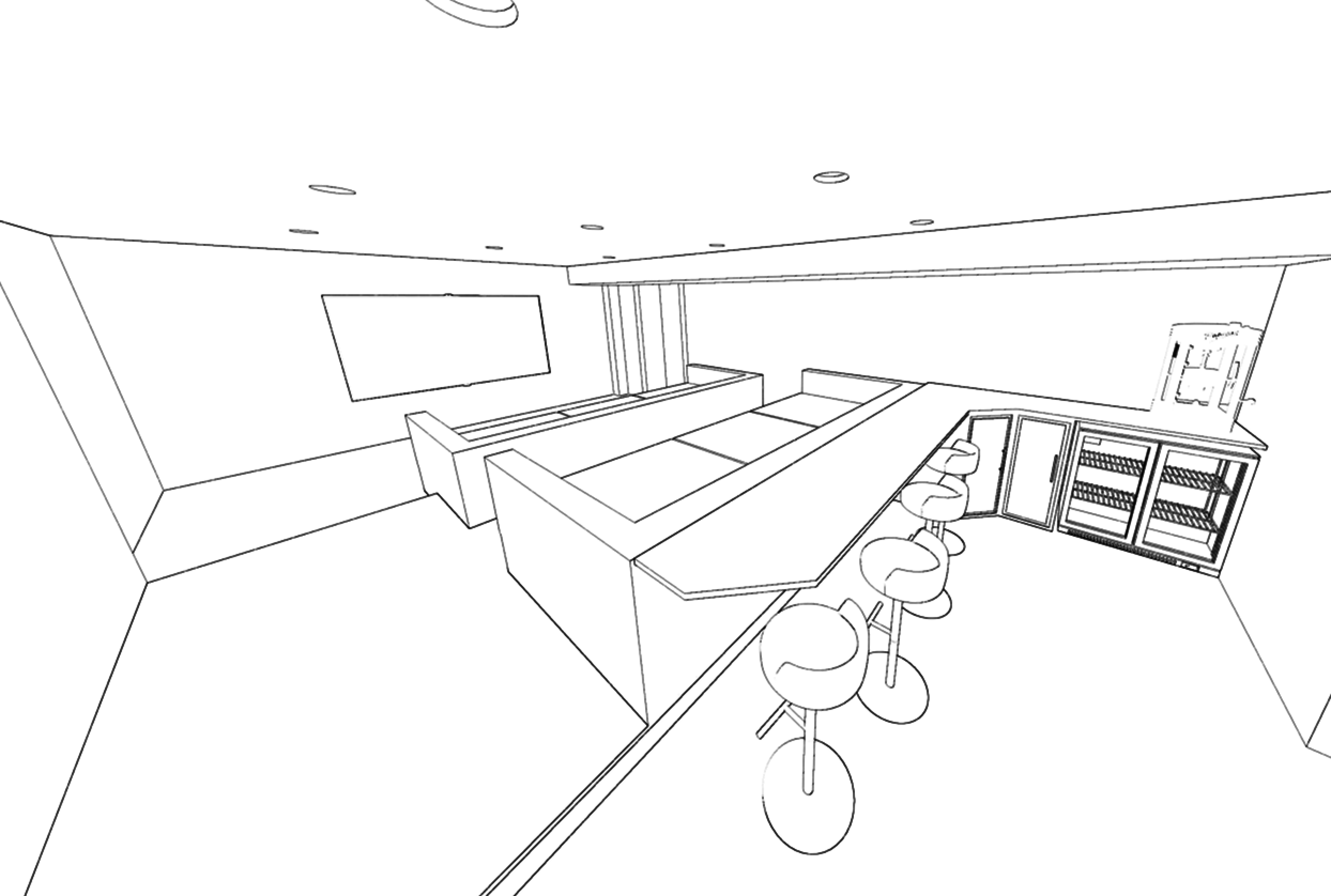 a modern stylish bar interior with a sleek and elegant atmosphere the main counter is finished in polished dark wood reflecting a rich mahogany hue the countertop is made from smooth white marble exuding luxury the barstools are upholstered in soft deep navy velvet providing a touch of sophistication the walls are painted a warm off white creating a cozy yet upscale ambiance the back cabinets are dark oak with glass paneled doors showcasing an array of multicolored illuminated bottles recessed ceiling lights emit a soft golden glow casting inviting shadows the overall atmosphere is chic modern and inviting keep geometry the same