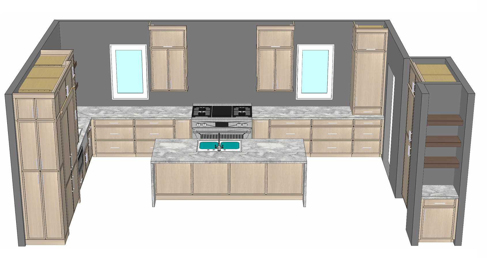do not change the cabinets in any way preserve the exact cabinet colors materials finishes dimensions door and drawer styles hardware spacing alignment and all geometry exactly as shown do not alter the countertop shape backsplash appliances flooring lighting fixtures or wall structure only remove the construction materials clutter and mess from the scene clean the room and make it look finished and staged add a few simple tasteful home accessories appropriate for the style of the space but do not add or remove any furniture windows or architectural elements maintain the original lighting direction and realism enhance clarity and polish the photo while keeping the cabinetry and room design completely unchanged do not alter the lighting to keep the cabinet colors as they are in the image do not change the walls keep the cabinet layout and hood as shown do not add windows just make the image look realistic