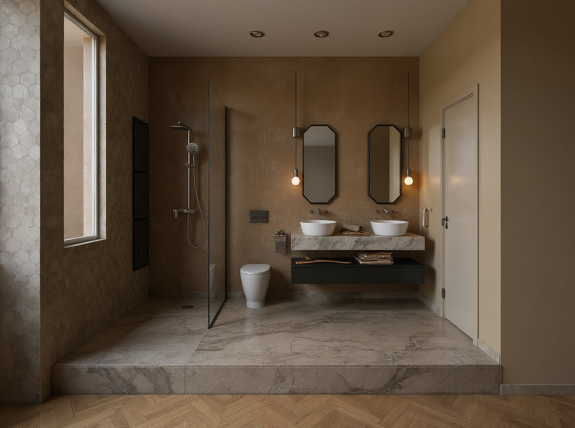 enhance realism of this interior render without changing the architecture furniture materials layout colors or composition keep the same camera angle improve natural daylight to create a sunny daytime atmosphere with soft natural shadows and realistic light bounce add subtle global illumination to increase depth in the room increase material detail the sofa fabric should appear as a white boucl with a soft tactile texture and light micro shadowing between tufted sections the lounge chair should have a natural caramelo leather texture with subtle creasing and matte finish the herringbone wooden floor should display refined natural grain and depth marble surfaces should show realistic veining and gentle reflectivity add soft ambient occlusion where the sofa chair shelves and objects meet surfaces adjust the wooden wall panels and door to a lighter natural oak tone carvalho natural with visible but subtle grain and a matte or low sheen finish without shifting toward yellow or warm tones the ceiling lighting is a stretched tensioned panel covered with a natural woven straw fabric tela de palha natural diffusing indirect light evenly across the environment ensure this material reads with texture softness and natural fiber detail maintaining a calm and contemporary atmosphere keep the final result crisp photorealistic and elegant no stylization