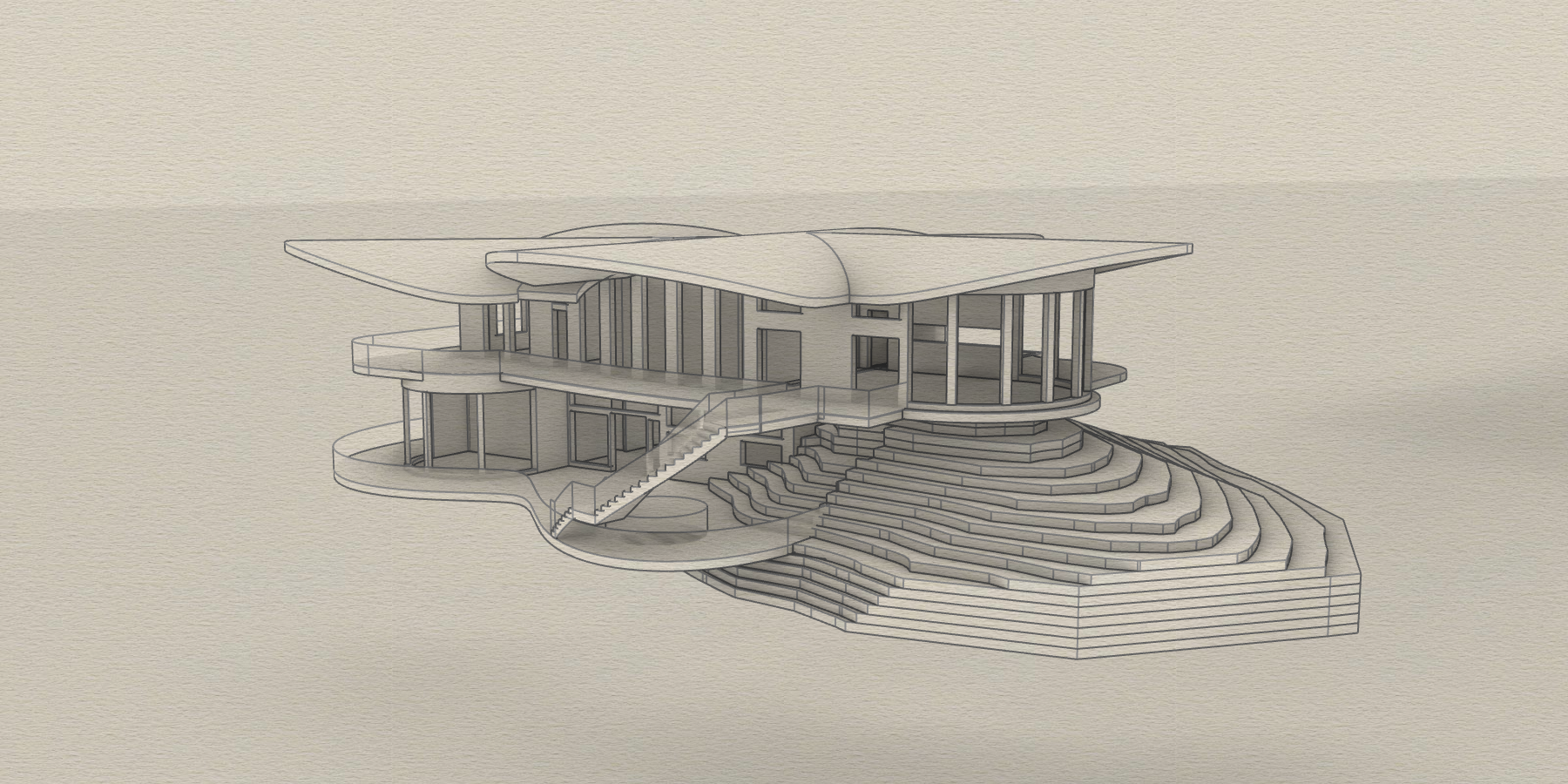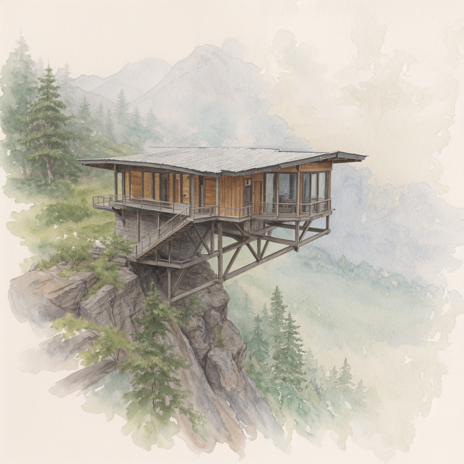 architectural watercolor rendering of a small contemporary research station perched on a rocky cliff structure made of warm wood black steel and glass precise and realistic architectural detailing cantilevered over stone terrain supported by steel beams surrounded by mountain pines and mist below rendered with crisp building geometry and realistic materials background and edges dissolve into loose watercolor washes and white paper edges not full bleed with soft unfinished fade around the image visible pencil and ink linework with light technical annotations artistic yet grounded balance of precision and painterly abstraction calm morning light concept architectural visualization style