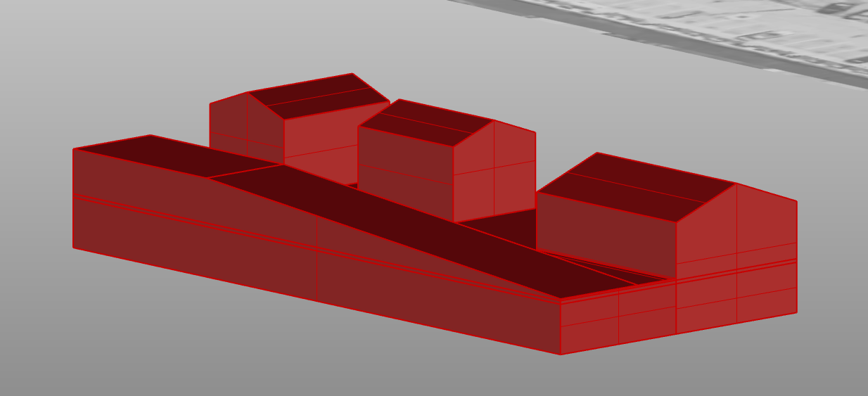 exterior shot a clean isometric architectural rendering of a terraced mixed use building on a sloped urban site a solid concrete base contains a neighborhood market and laundromat with large glass storefronts above wide exterior staircases and stepped terraces with planted garden beds rise along the slope the upper levels feature greenhouse inspired glass volumes with pitched roofs and slender steel frames used as community gathering and growing spaces materials include exposed concrete green steel and clear glass human figures soft interior lighting and visible greenery minimal background professional architectural visualization style