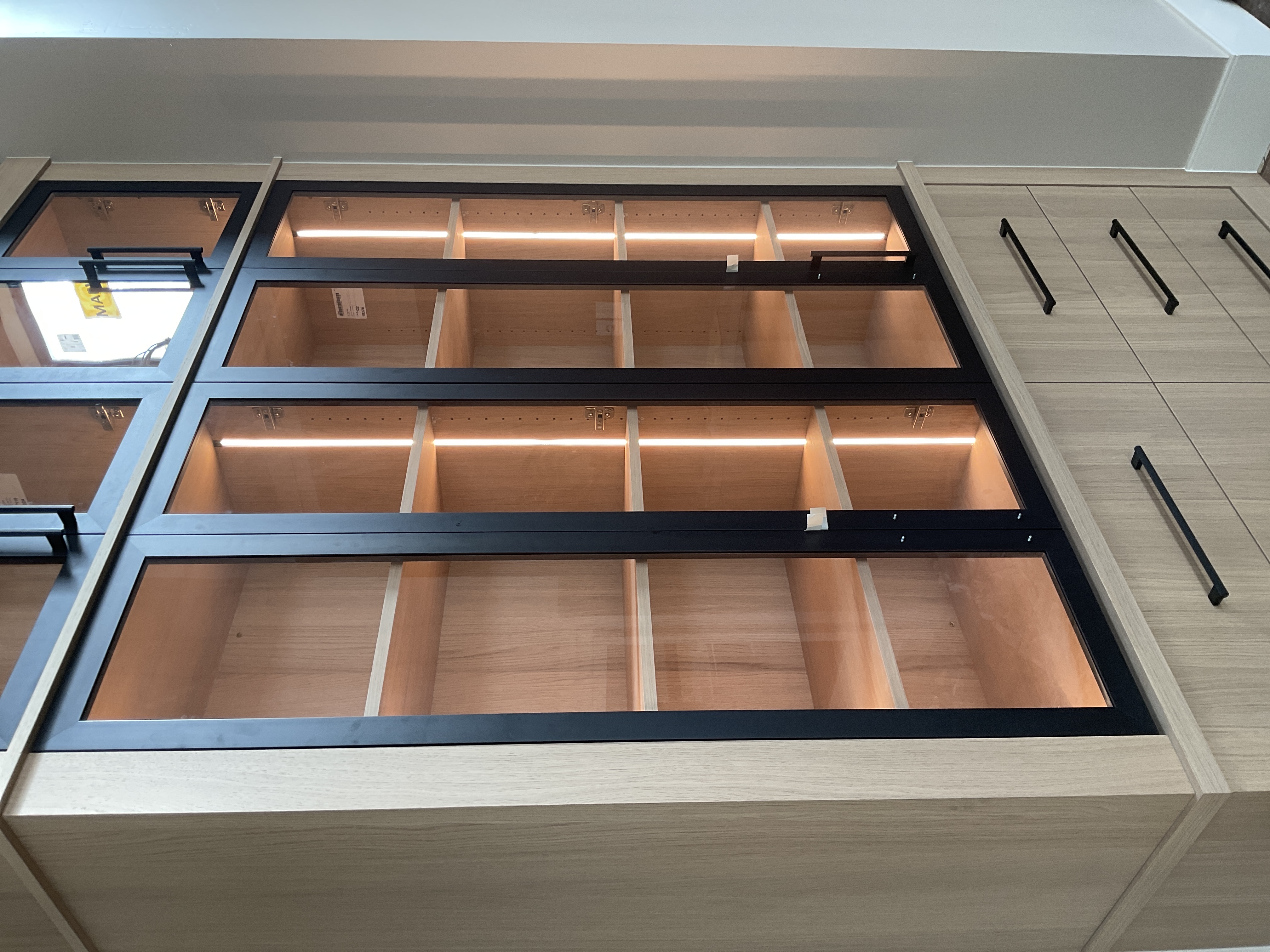 do not change the cabinets in any way preserve the exact cabinet colors materials finishes dimensions door and drawer styles hardware spacing alignment and all geometry exactly as shown do not alter the countertop shape backsplash appliances flooring lighting fixtures or wall structure only remove the construction materials clutter and mess from the scene clean the room and make it look finished and staged add a few simple tasteful home accessories appropriate for the style of the space but do not add or remove any furniture windows or architectural elements maintain the original lighting direction and realism enhance clarity and polish the photo while keeping the cabinetry and room design completely unchanged do not alter the lighting to keep the cabinet colors as they are in the image stage the shelves in the glass cabinet for a luxurious modern kitchen