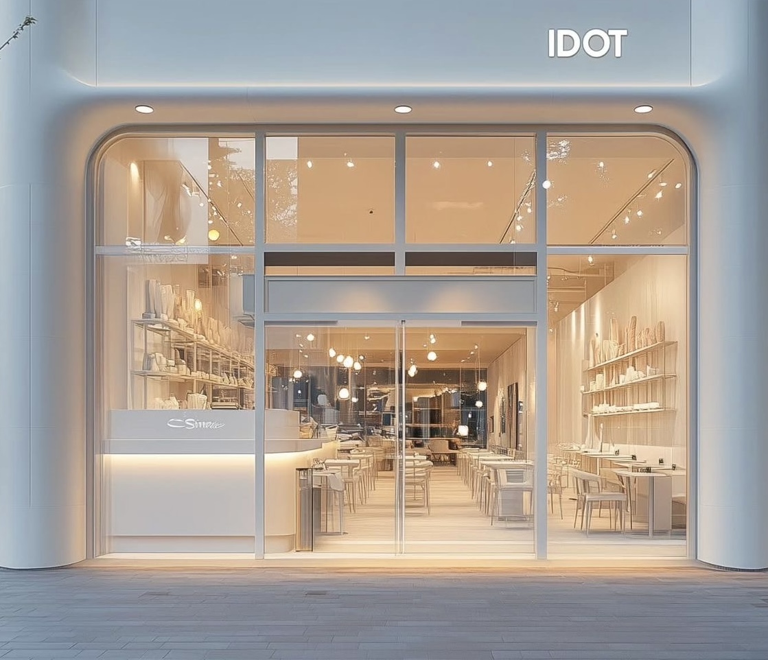 exterior shot can you create a store front linear sketch that has these panel screens behind the glass shopfront