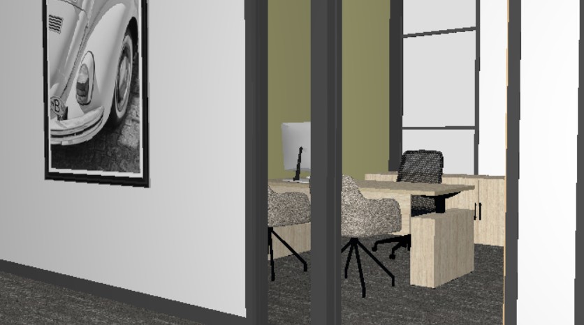 render image keeping all colors and finishes and architecture the same make photo realistic make ceiling a 2x4 office grid with lights make outside background a parking lot with a field