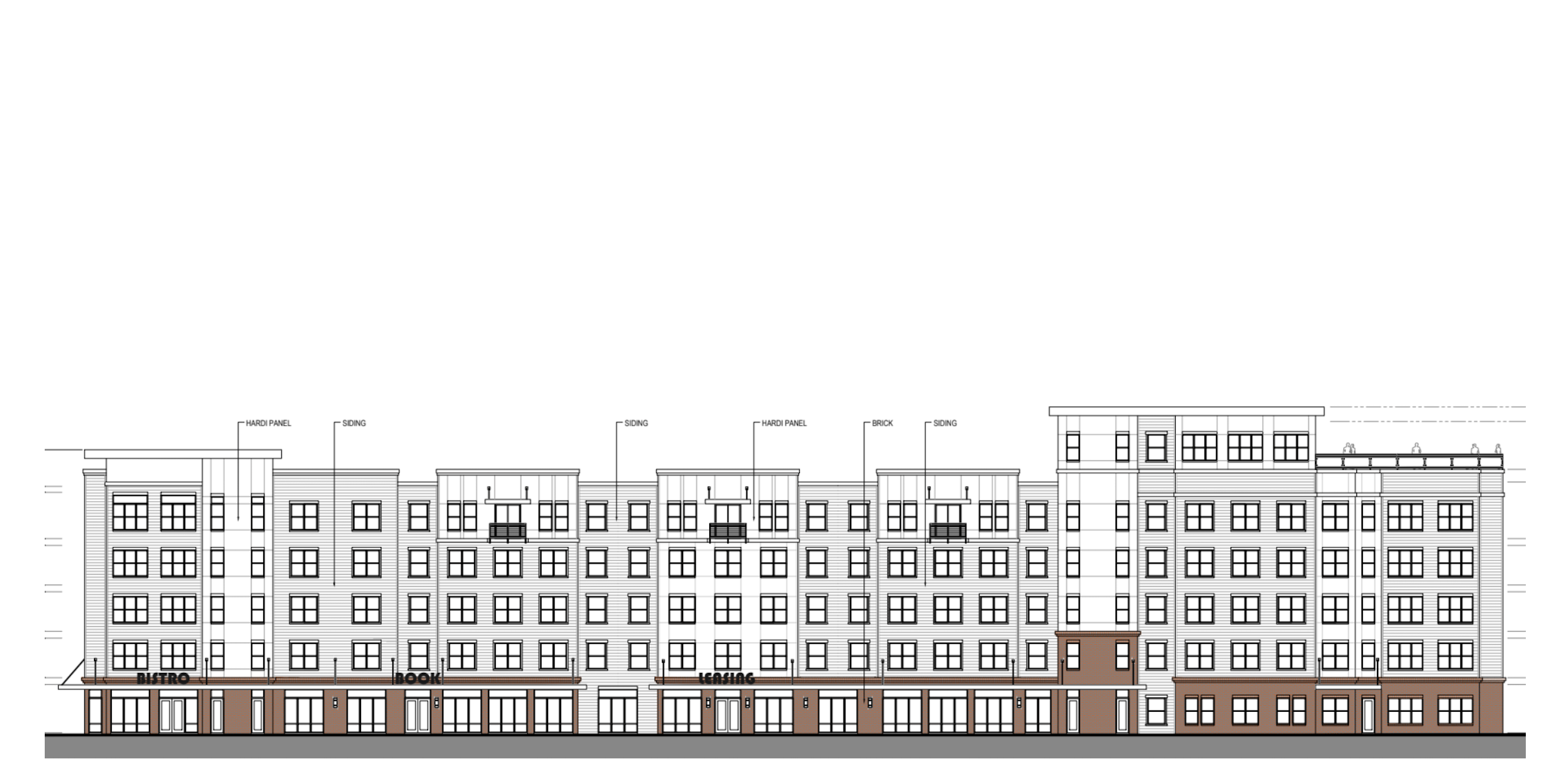 do not crop the image make the brick at the bottom be light gray and white washed in color make the panel siding sections black make most of the siding white use brown for accents render the entire image do not cut out or crop any of the image