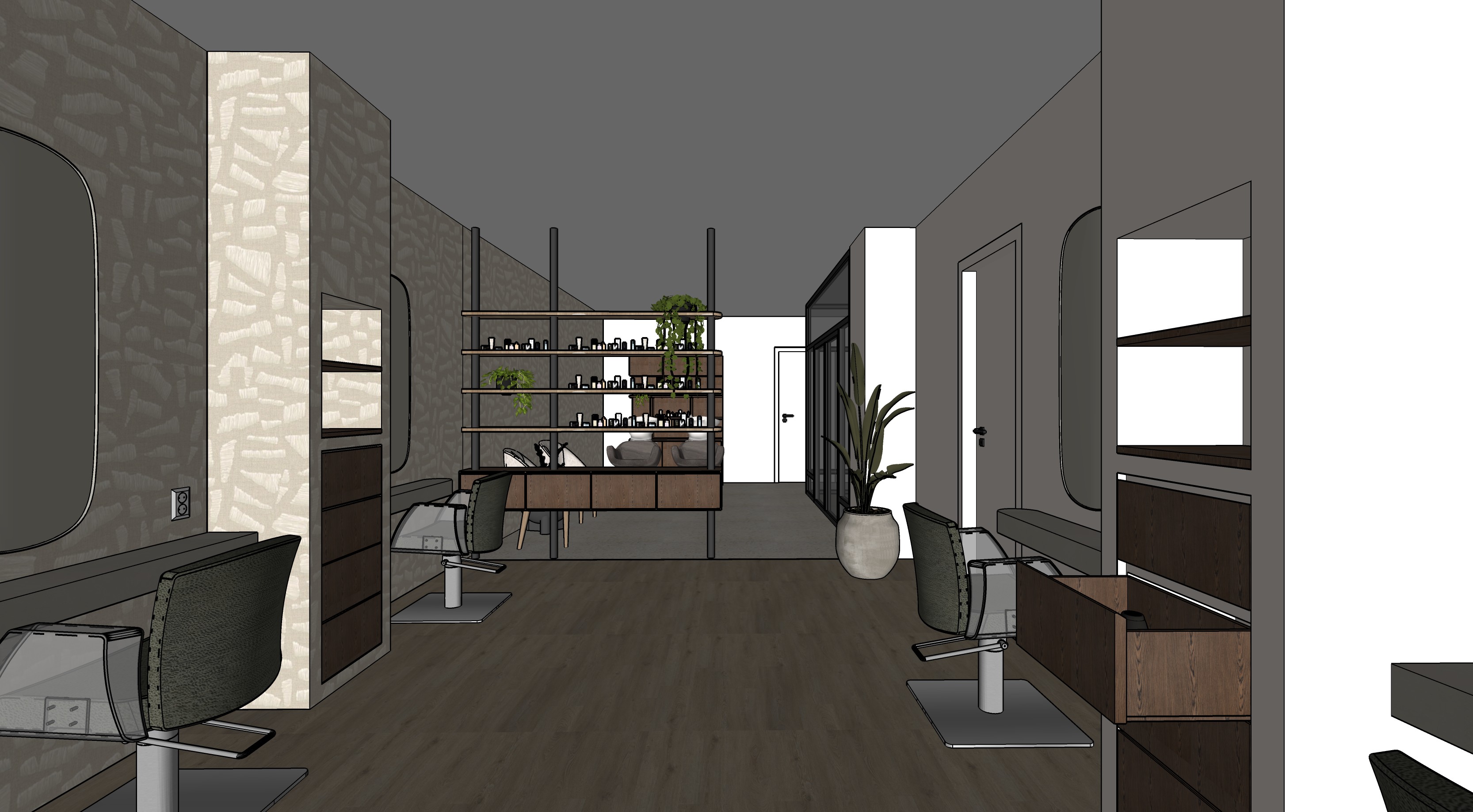 make a photorealistic image with some natural lighting decoration in the cabinet hairdressing things do not change anything in materials only use the existing materials and interior items the floor is a light wood floor with not too much wood details the walls are in the same material as the pilar cabinets