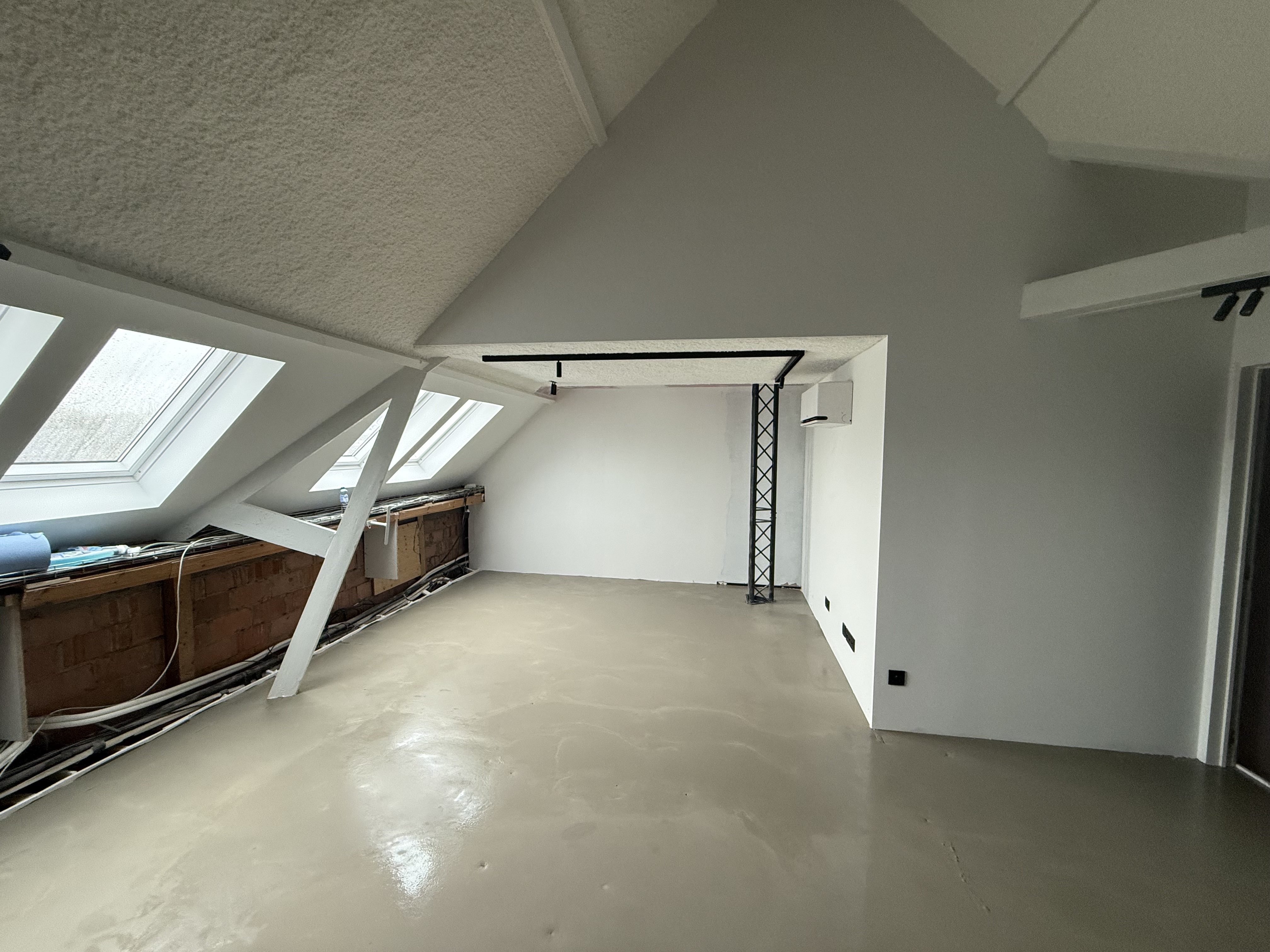 finish this office in the back there should be a big black cupboard without handles so hiding the complete back wall in the lower ceiling part also hiding the black truss construction in front of that under the separation of the high en lower ceiling part a big oval black wooden desk on one side it will be cut off straight to mount it against the wall with black office chair apple imac and 2 dining chairs dark brown carpet on the floor and black storage cupboards without handles on the left side