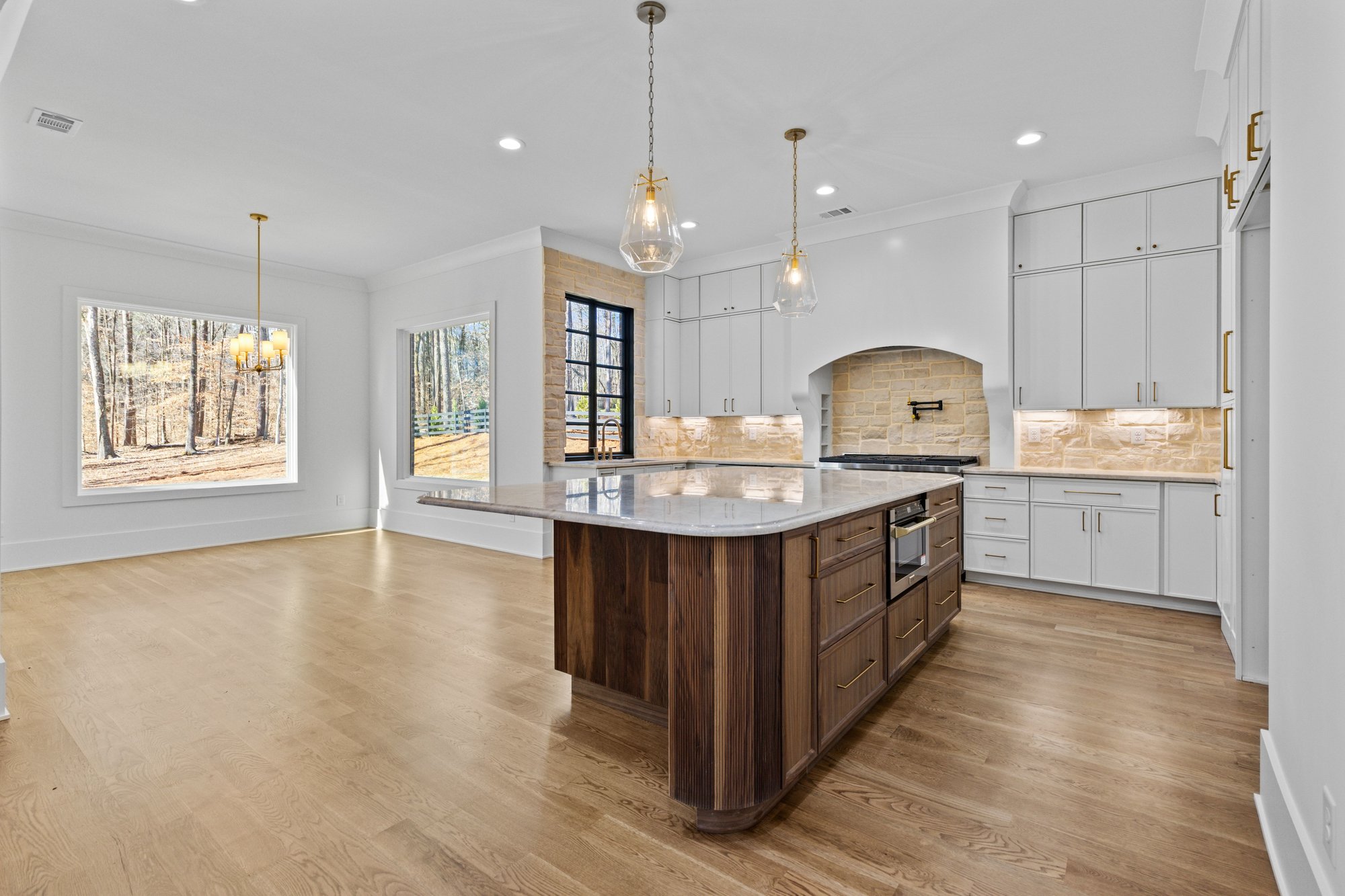 do no change any details other than adding chairs at the island ad breakfast table and chairs on the room in the back do not add anything to the island structure put lemon fruit bown on the island