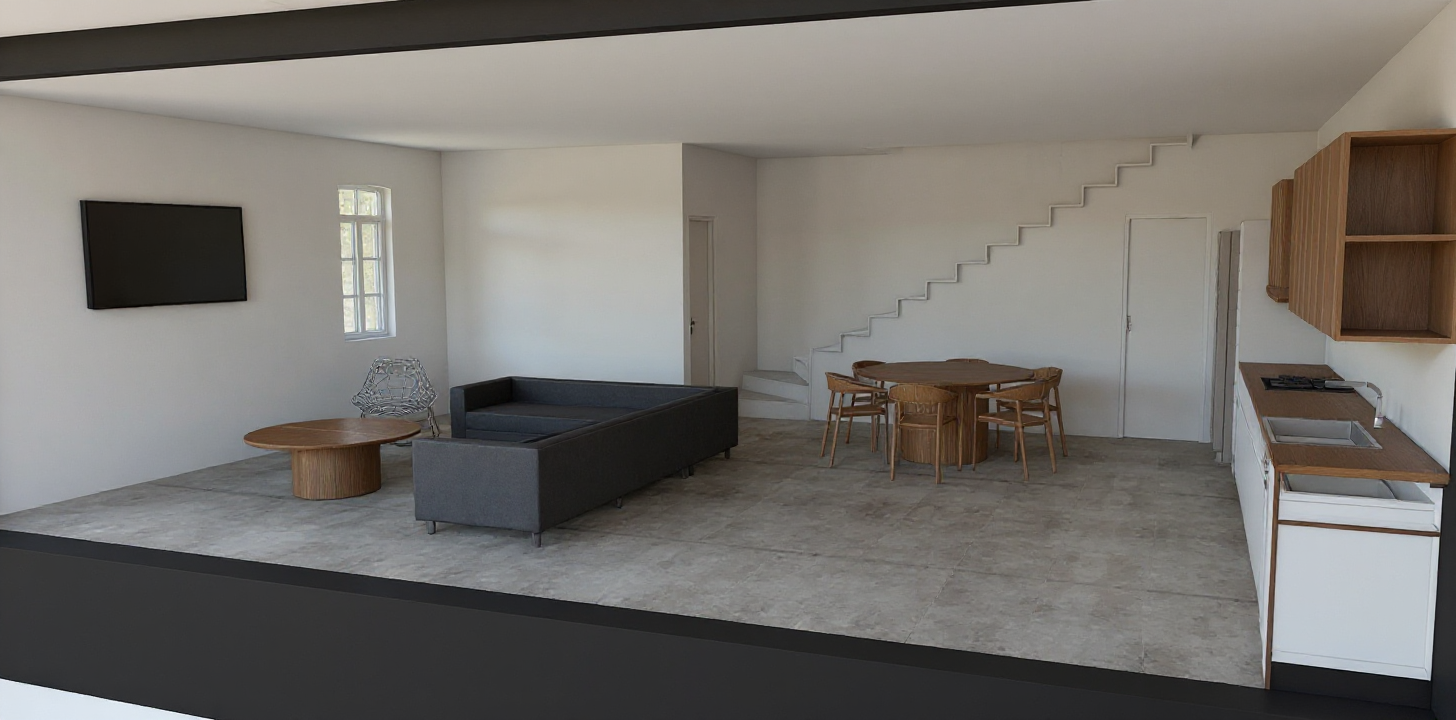 convert to a modern farmhouse style with black vertical board and batten walls and cedar wood window trims with sconce lights at front door and garage doors with california native landscape and trees in slight overcast weather lights shining through windows and doors