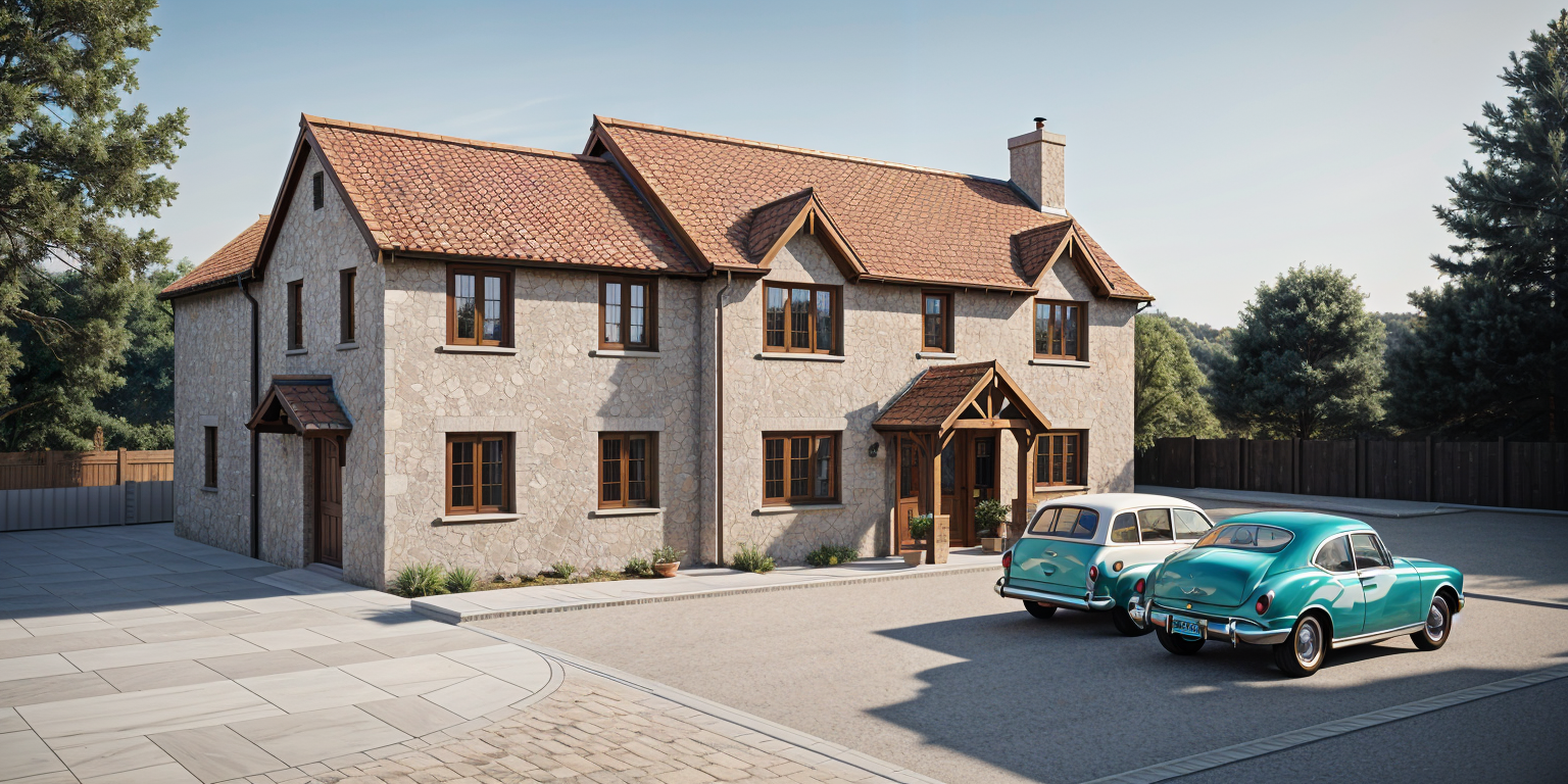 exterior shot a charming single story house with a creamy beige exterior and a dark brown roof the house is surrounded by lush green hedges and tall palm trees the front courtyard features a wooden gate and a neatly trimmed lawn a bright blue sky adds a serene and peaceful atmosphere to the scene