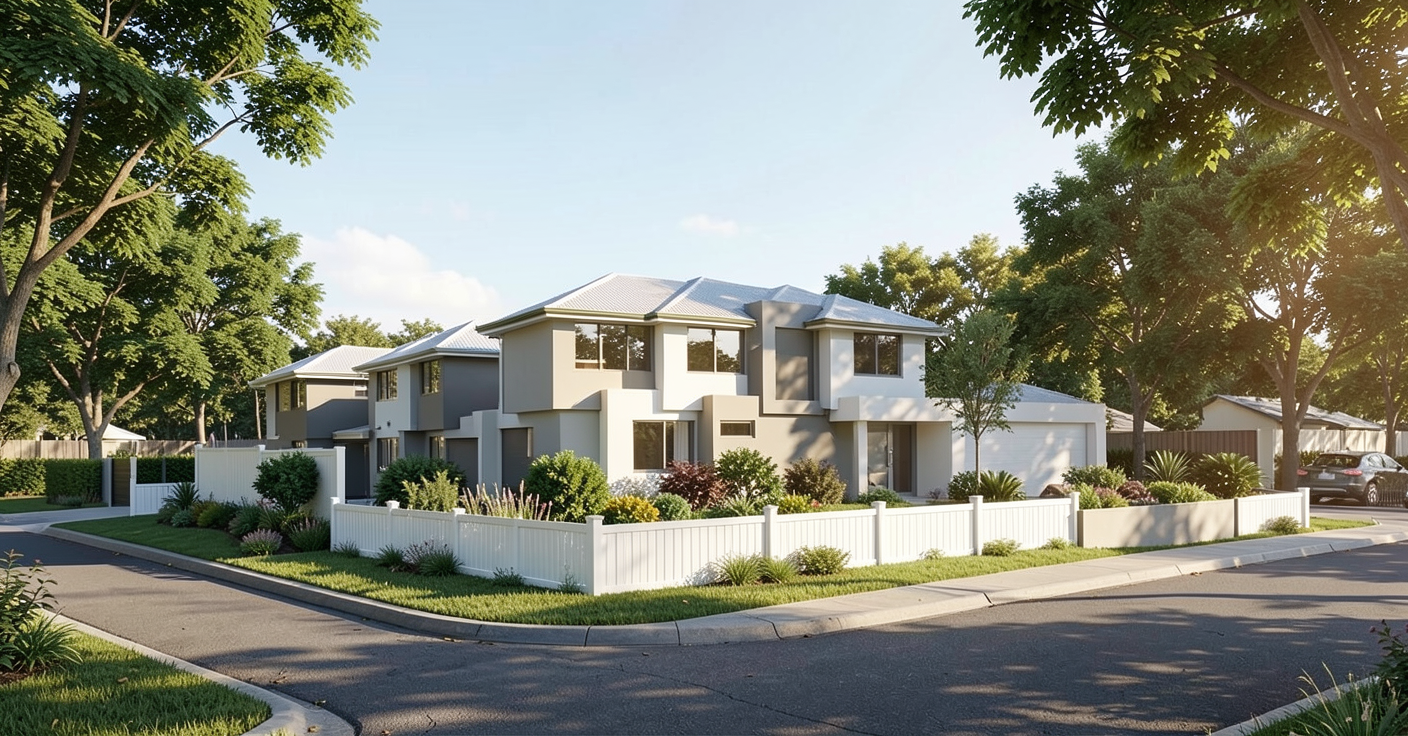 sunny afternoon side white colorbond fencing low garden street facing single storey house both sides
