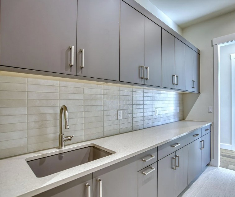 do not change the cabinets in any way preserve the exact cabinet colors materials finishes dimensions door and drawer styles hardware spacing alignment and all geometry exactly as shown do not alter the countertop shape backsplash appliances flooring lighting fixtures or wall structure only remove the construction materials clutter and mess from the scene clean the room and make it look finished and staged add a few simple tasteful home accessories appropriate for the style of the space but do not add or remove any furniture windows or architectural elements maintain the original lighting direction and realism enhance clarity and polish the photo while keeping the cabinetry and room design completely unchanged do not alter the lighting to keep the cabinet colors as they are in the image change the backsplash to white and stage the countertop for a pantry