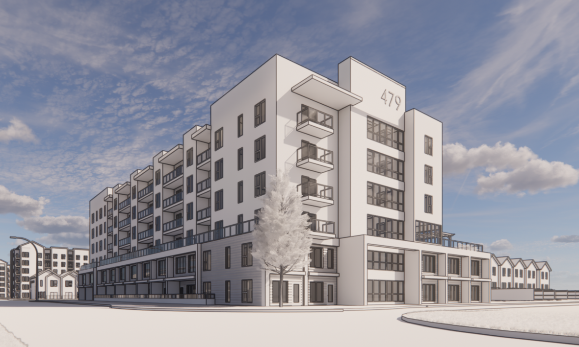 render this 6 storey multi family building in a west coast contemporary style keeping all existing geometry proportions and massing exactly as shown express the shift entirely through materials tone and detailing not form use a sophisticated natural palette inspired by the pacific northwest warm wood accents cedar or hemlock charcoal and graphite toned metal panels smooth fiber cement or stucco in complementary neutral greys and black framed glazing introduce vertical material differentiation to break up the scale alternating between darker metal cladding and lighter neutral panels for depth and rhythm render this 6 storey multi family building in a modern farmhouse style maintaining all existing geometry proportions and massing exactly as shown express the design through materiality and tone rather than changing form use a balanced farmhouse inspired palette that scales well for mid rise construction off white or light warm grey siding limited to lower portions or select vertical bays contrasted with deeper charcoal taupe or muted sage toned vertical panels on alternating sections to create vertical colour separation and break down mass integrate natural wood accents around balconies soffits or entries to add warmth and authenticity upper four storeys should use a thoughtful mix of light and medium toned materials not solid white to maintain depth and reduce visual bulk retain black or dark bronze window frames and simple trim ground level can be anchored with darker more tactile materials such as stone veneer brick or textured metal cladding ensure lighting is soft and warm to highlight texture and vertical articulation the overall feel should be modern farmhouse reinterpreted for scale timeless cohesive with the surrounding community and visually rich through tone and material contrast without altering any architectural geometry architecture