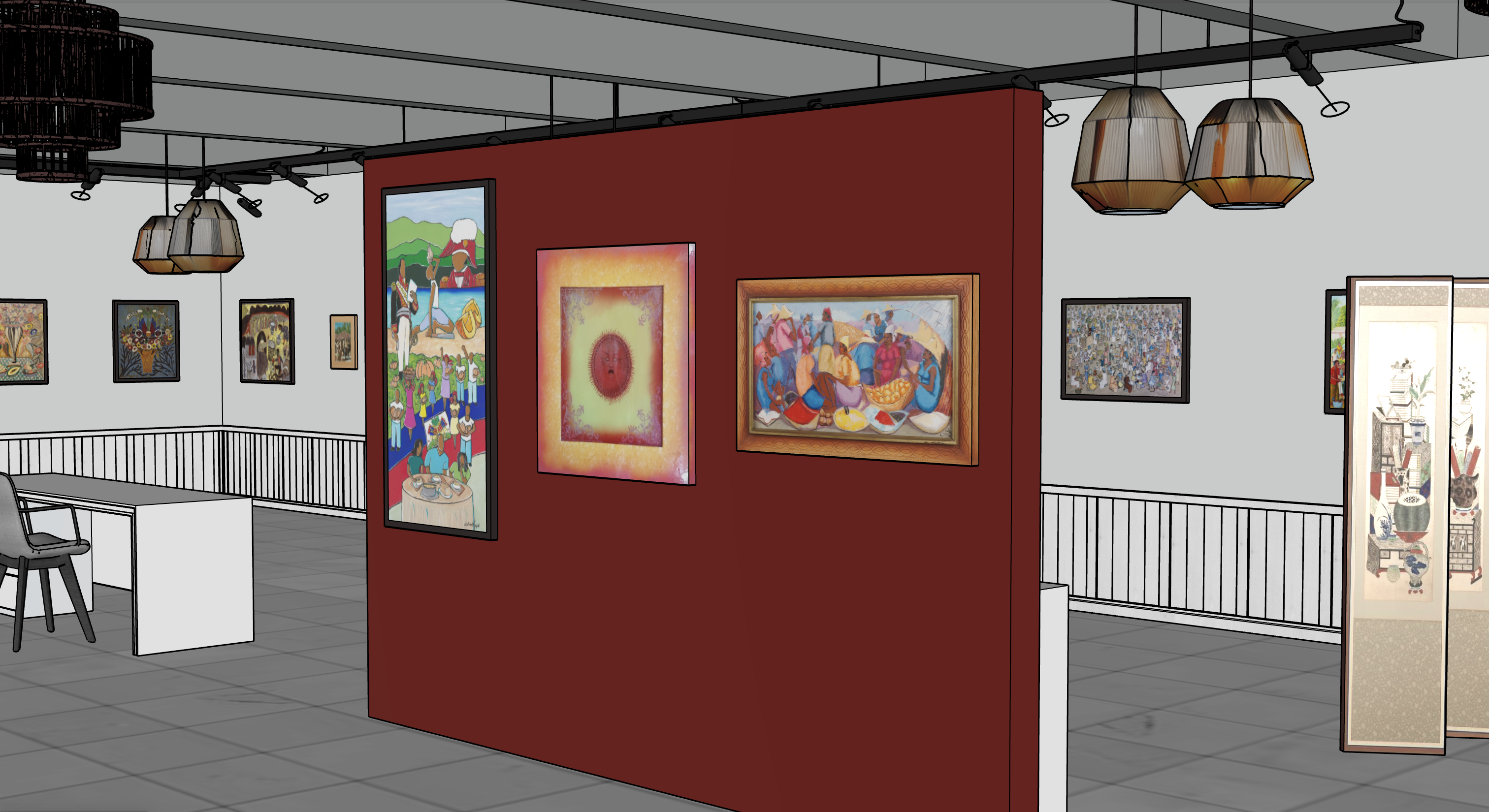 photorealistic architectural interior render enhancement of the uploaded image preserve all existing geometry wall locations object placement artwork size spacing framing and camera perspective exactly as shown do not add remove resize rotate recolor or reinterpret any walls artwork frames pedestals seating lighting fixtures ceiling elements or floor layout enhance realism only through refined lighting accuracy improved material response and increased texture clarity while keeping all original materials and colors unchanged interior museum gallery space featuring a deep red freestanding exhibition wall with framed artworks surrounding white perimeter walls with wainscoting polished concrete flooring exposed ceiling with track lighting and pendant fixtures lighting professional museum gallery lighting neutral white illumination no warm cinematic or dramatic color cast track lights evenly illuminating artwork without hotspots or glare soft ambient fill light to balance shadows subtle realistic shadowing at floor and wall intersections materials realism accurate matte paint finish on red wall with even tone crisp artwork frames with subtle depth and realistic glazing correct glass reflections without distortion clean concrete floor with soft realistic reflections style high end architectural visualization professional museum interior clean modern realistic neutral color balance documentary realism