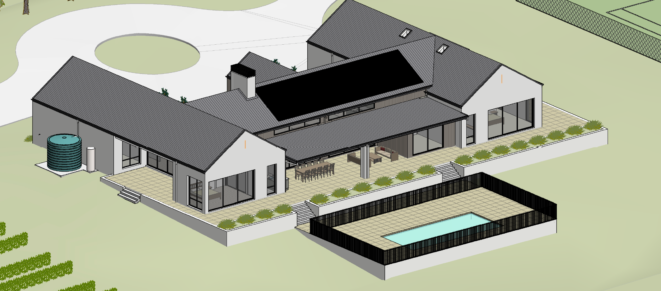 hyperrealistic architectural visualisation modern australian farmhouse rear view white painted brick dark charcoal colorbond roof black framed floor to ceiling glass sliding doors opening to wide alfresco long rectangular lap pool with black coping in foreground outdoor dining with string lights vineyard rows visible to right tennis court glimpsed to left open rural paddock views golden hour late afternoon light slight elevated 3 4 aerial angle photorealistic ultra detailed