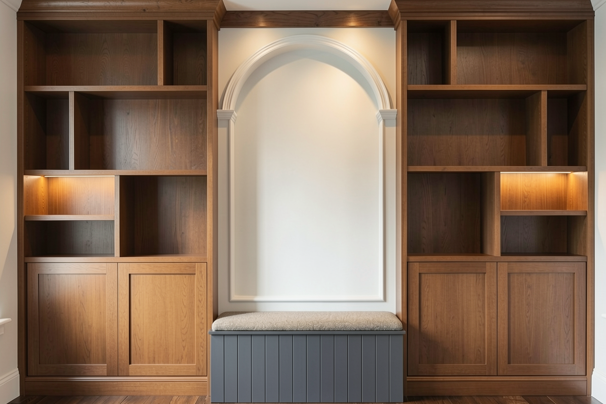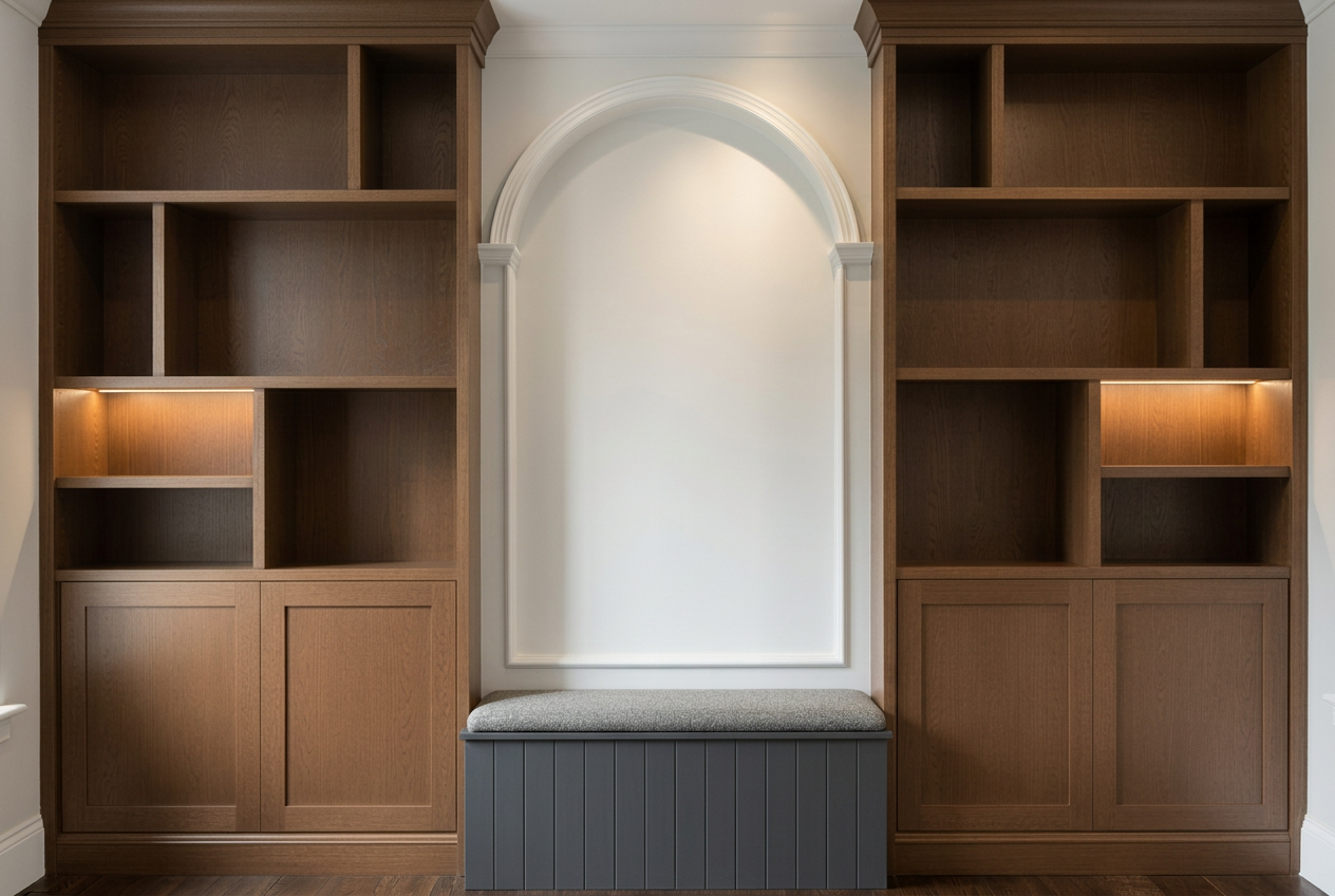revise the built in bookshelves design to simplify the millwork detailing replace the current ornate traditional crown molding at the top with a flat stock cap the top should be clean and modern no stepped profiles no dentil no layered crown just a simple flat horizontal board square edge minimal projection at the arch remove the traditional decorative applied molding profile replace it with a simple half round applied molding following the curve of the arch the half round should be clean minimal and consistent in thickness no compound curves or classical detailing overall aesthetic modern simplified minimal millwork detailing avoid traditional colonial or ornate trim styles keep proportions balanced and refined