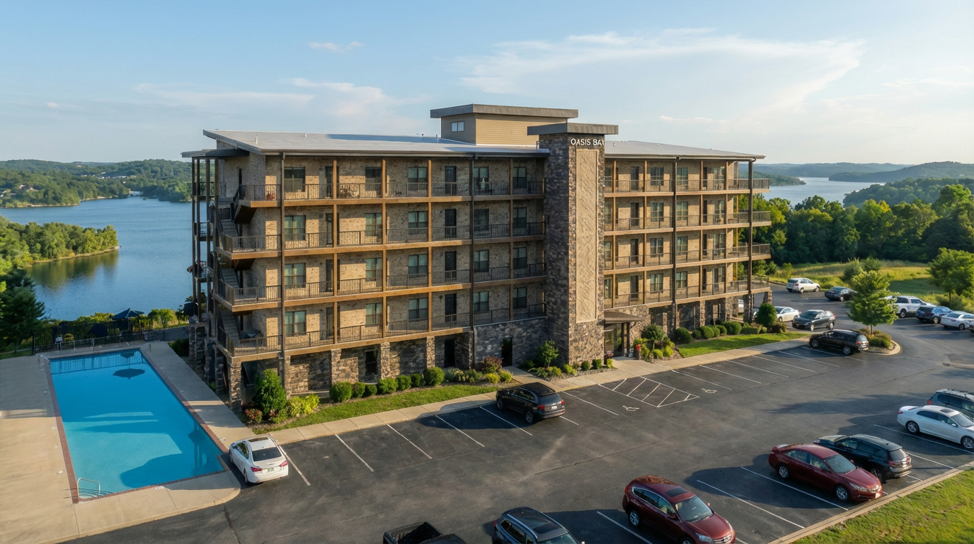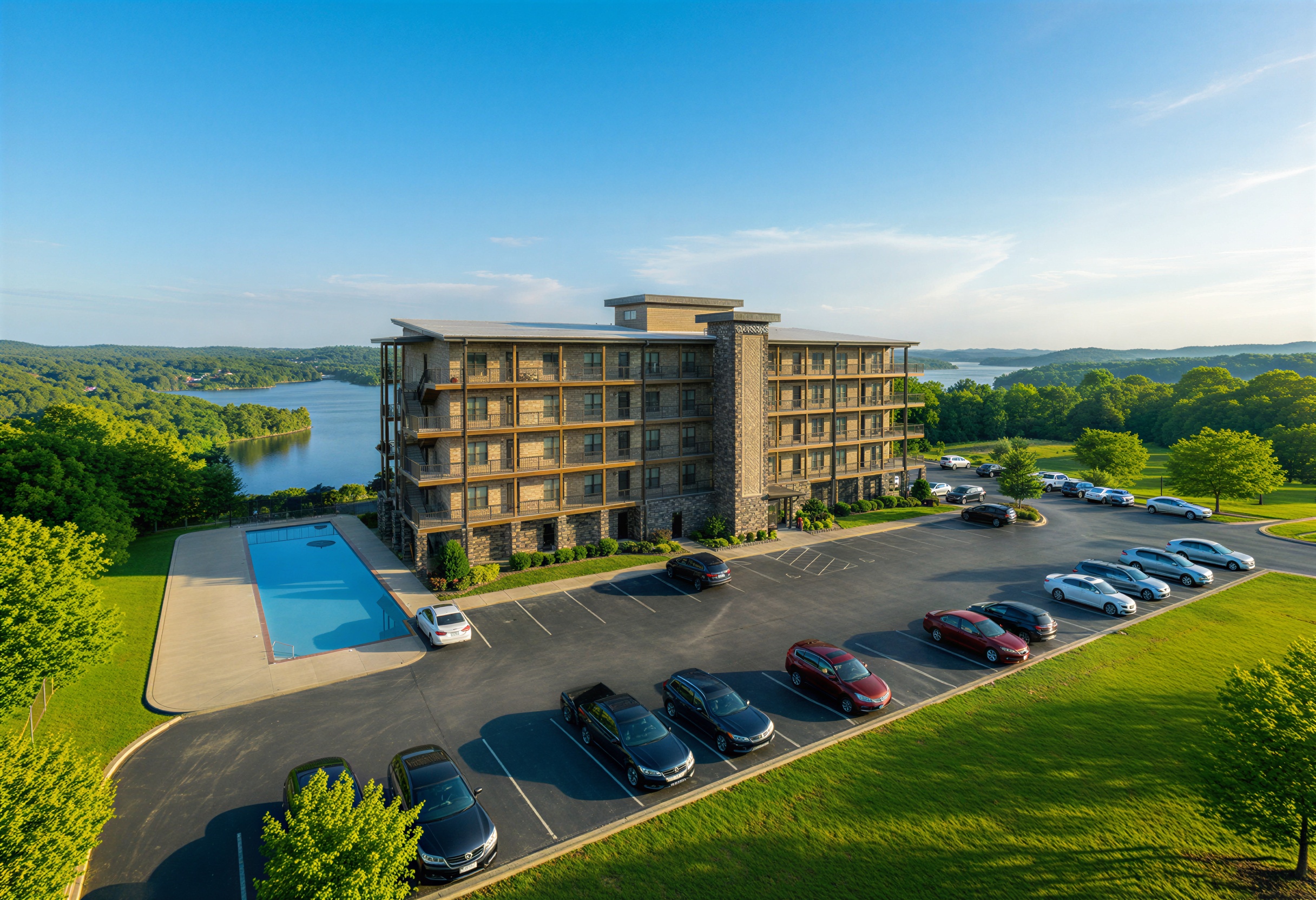 extend the rectangular swimming pool significantly longer toward the left side of the image maintaining the same width blue water color tile edges and surrounding concrete deck keep exact perspective shadows and reflections consistent with the rest of the photo do not change the building parking lot trees or lake