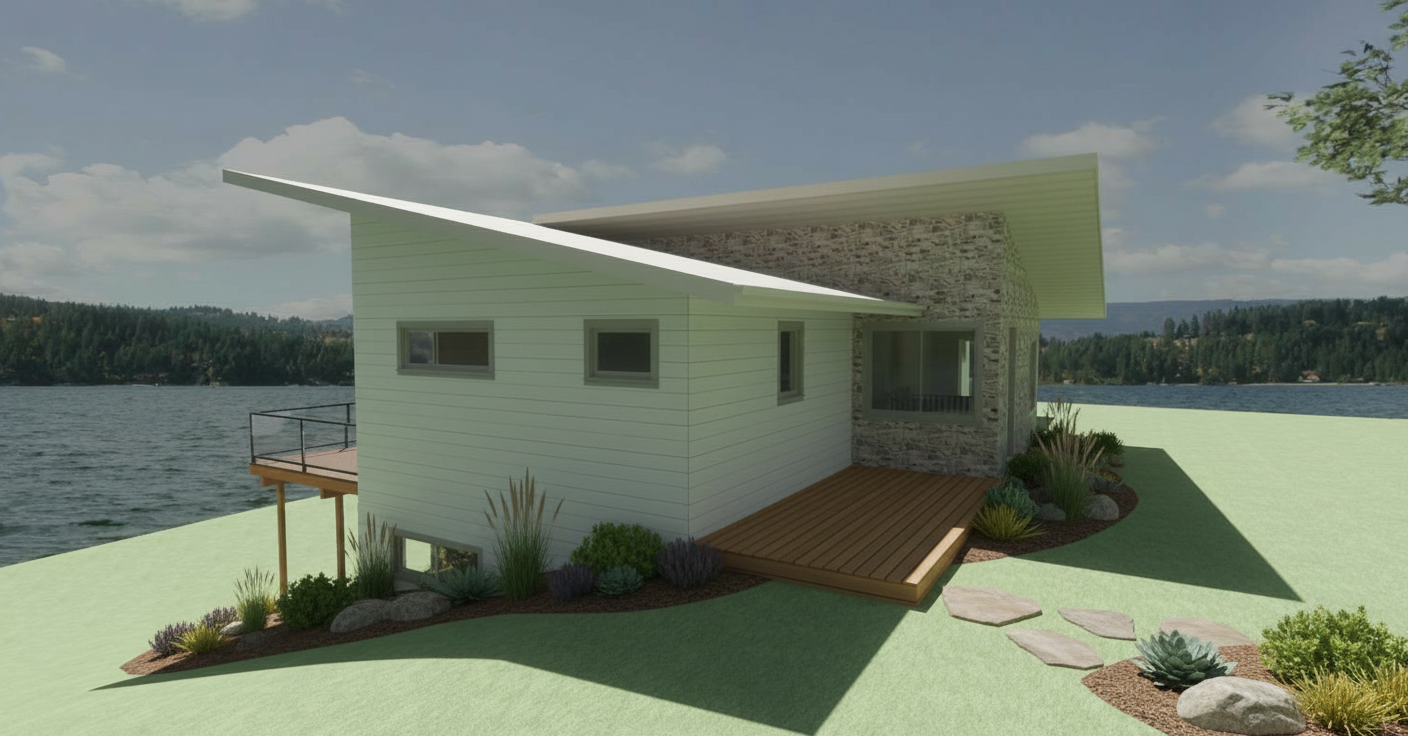 create secondary flat roof over entrance on right side of stone