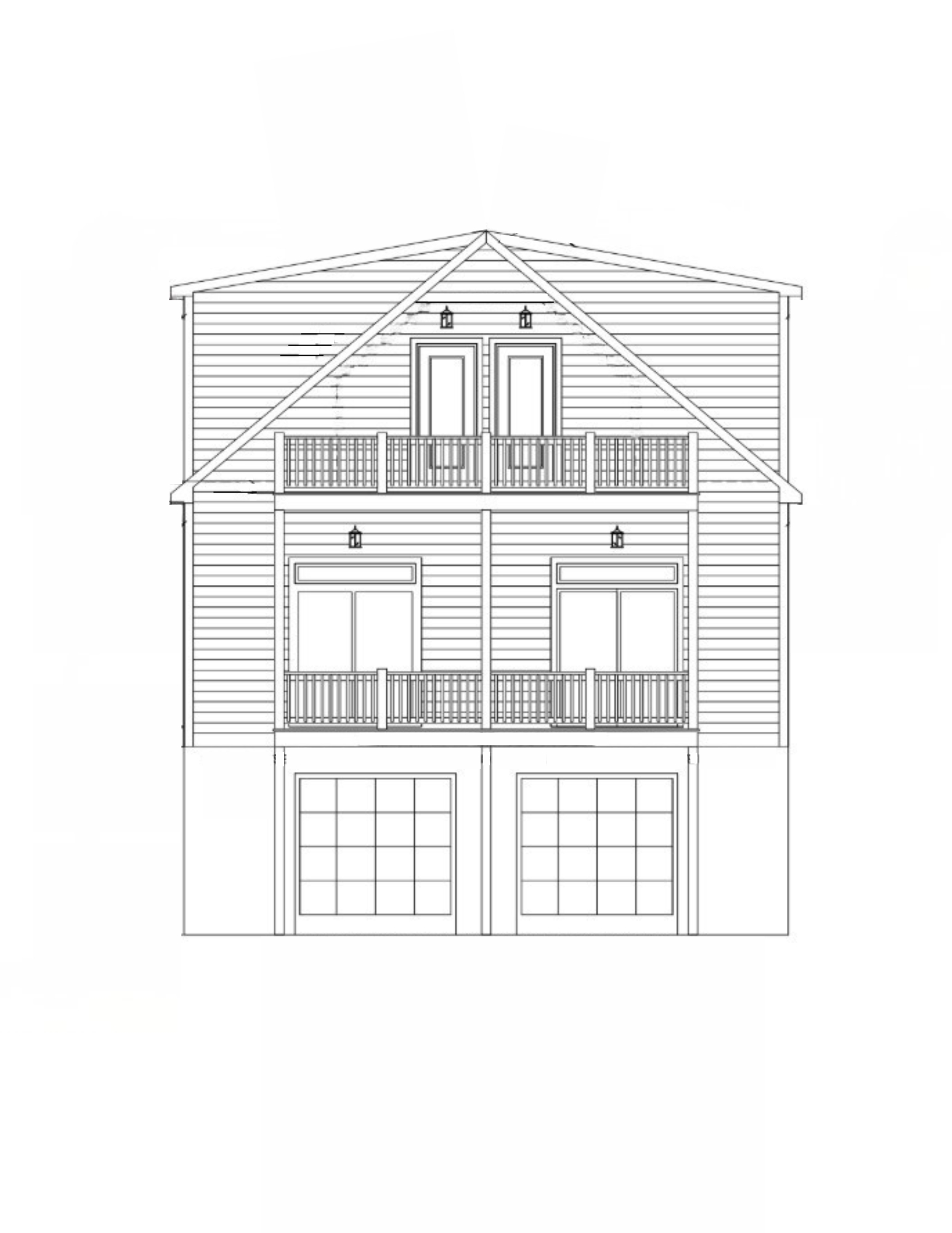 create a beautiful rendering of a two story house with classic architectural design the house features a gabled roof and symmetrical arrangement use a soft beige color for the siding with white trim around the windows and doors the railings on the balconies should be a warm brown wood the roof should be a dark gray providing a sleek contrast set the scene in a peaceful suburban environment with a clear blue sky and a few fluffy white clouds add some greenery with a well maintained lawn and small shrubs flanking the front the atmosphere is calm and inviting evoking feelings of warmth and comfort