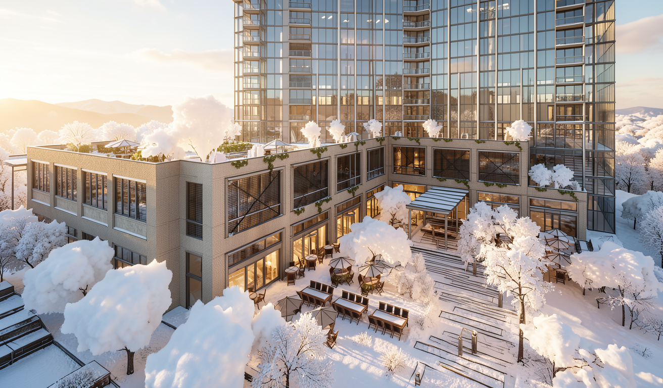 the countertops and backsplash are a warm white stone with subtle brown veining called taj mahal the wood should be a slightly cool toned walnut the floors are a light white oak wide plank flooring make the faucet hardware a brushed champagne bronze color add soft sunlight coming in the windows and a little bit of styling to the open shelving