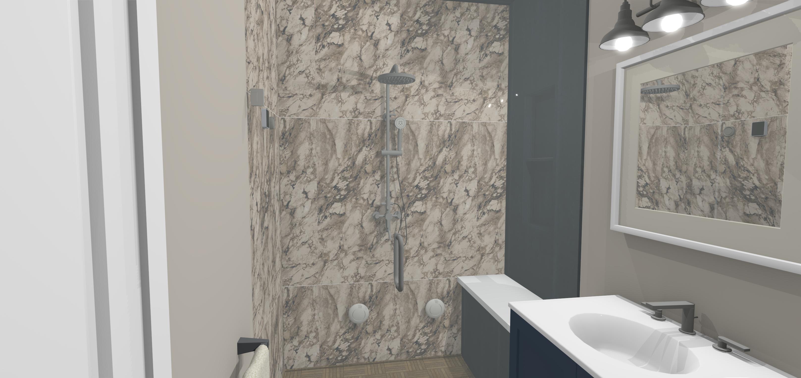 generate a stunning bathroom interior with a modern elegant feel the shower space is adorned with luxurious marble patterned tiles in a blend of beige and grey tones adding sophistication the beige walls complement the marble providing a warm undertone the vanity features a sleek white countertop with a dark blue cabinet offering a striking contrast the bathroom lighting consists of elegant black fixtures with soft warm white bulbs casting a cozy glow ensure the mirror frame is a clean white aligning with the minimalist aesthetics the floor displays a wood texture in natural brown hues enhancing warmth and comfort the atmosphere is tranquil and inviting perfect for relaxation