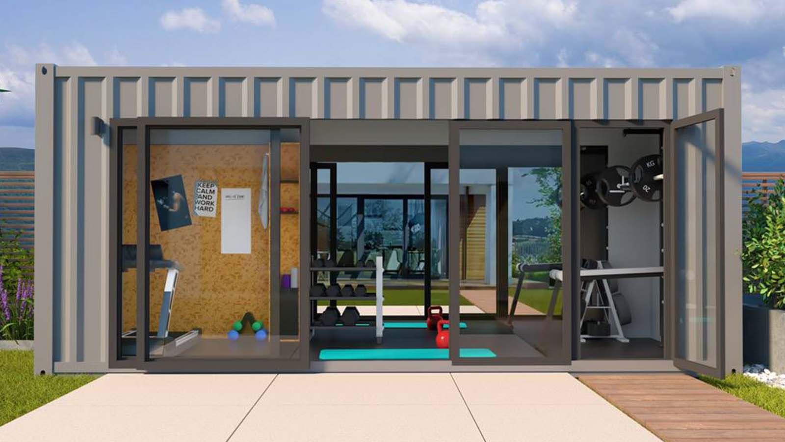 modernist exterior shot shipping container out house gym realistic modern with garden being used as gym architecture