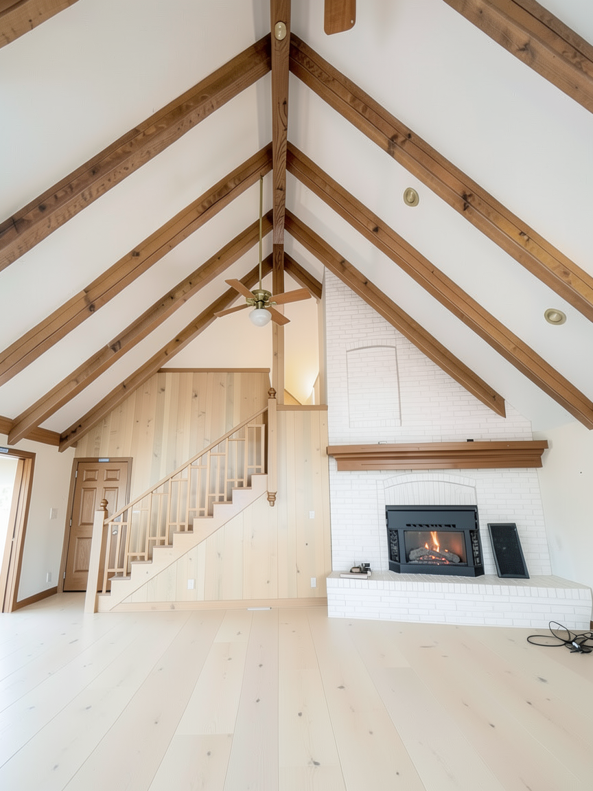 paint the vertical wood wall paneling a soft blue gray color with a subtle matte finish light desaturated blue gray tone modern coastal interior palette while keeping the exposed ceiling beams and wood trim natural wood