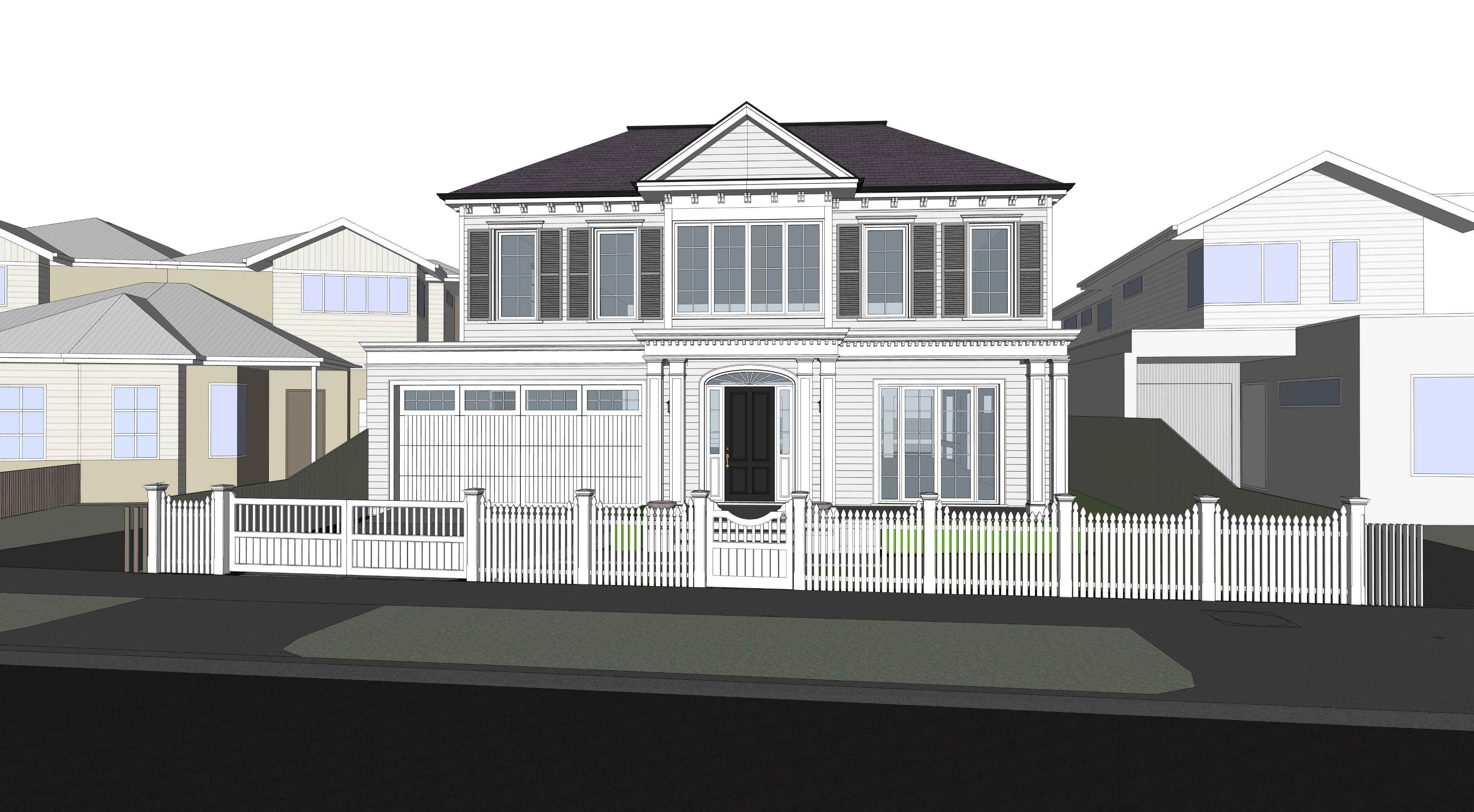 neo classical home simple square column slate roofing garage door on the left side facing the street wet road photorealistic render sunny day raytracing