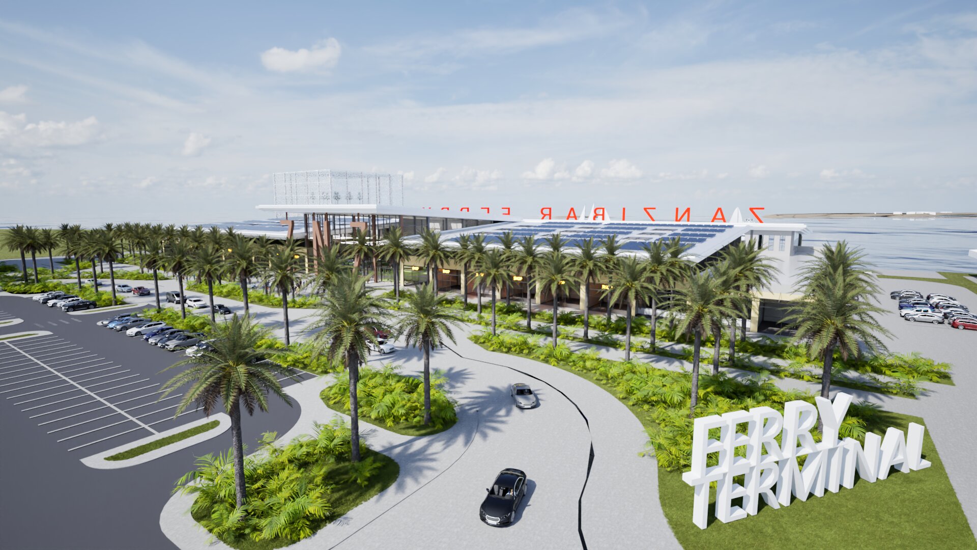 render a modern ferry terminal surrounded by lush palm trees under a clear blue sky the terminal s architecture is sleek and contemporary with large glass panels reflecting the sunlight the parking lot is filled with a variety of cars and the pathways are lined with bright green foliage the atmosphere is vibrant and inviting capturing a sunny day with a few fluffy white clouds incorporate bold red signage atop the building for a striking visual contrast the overall mood is lively and dynamic perfect for a travel hub