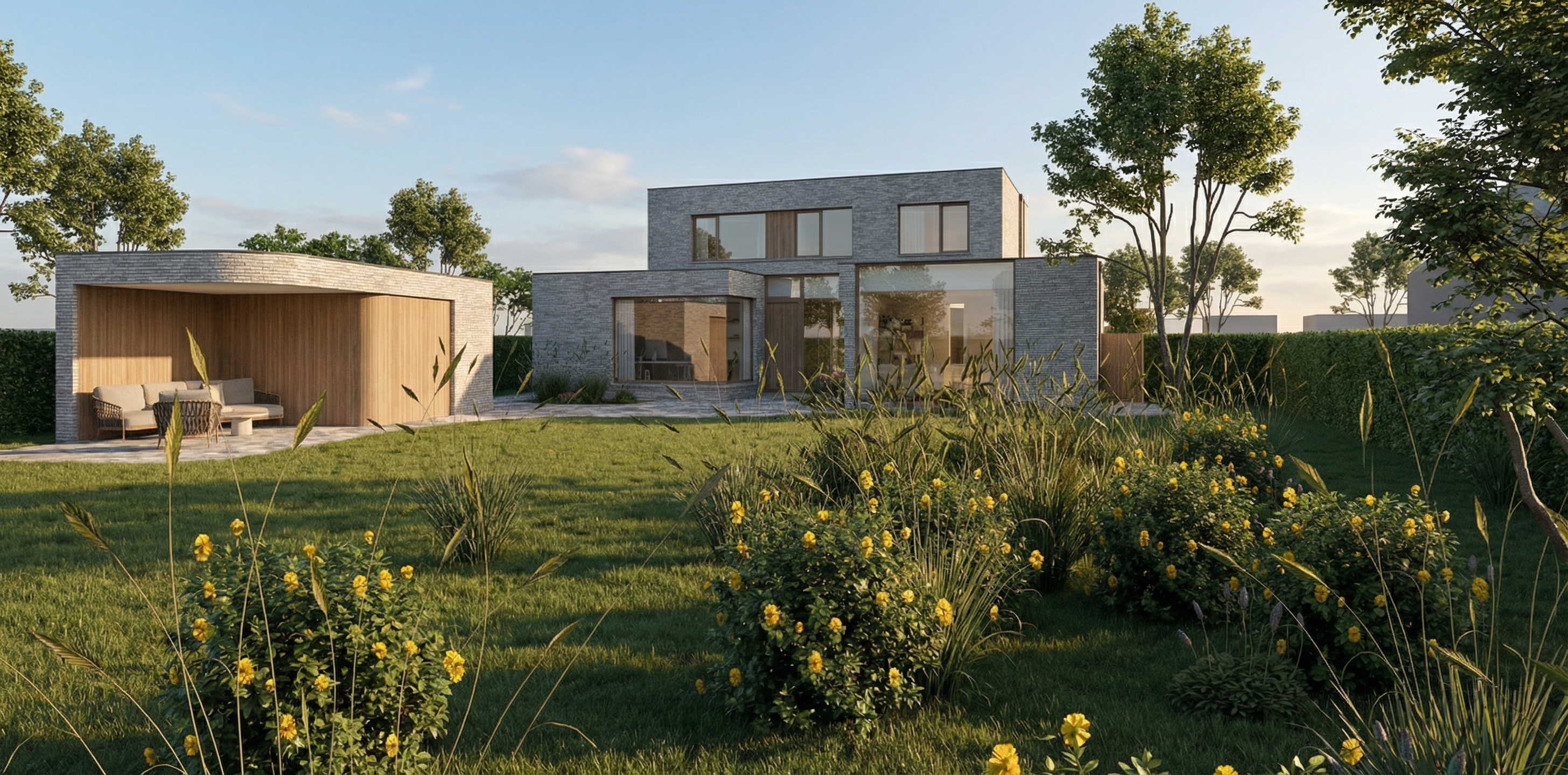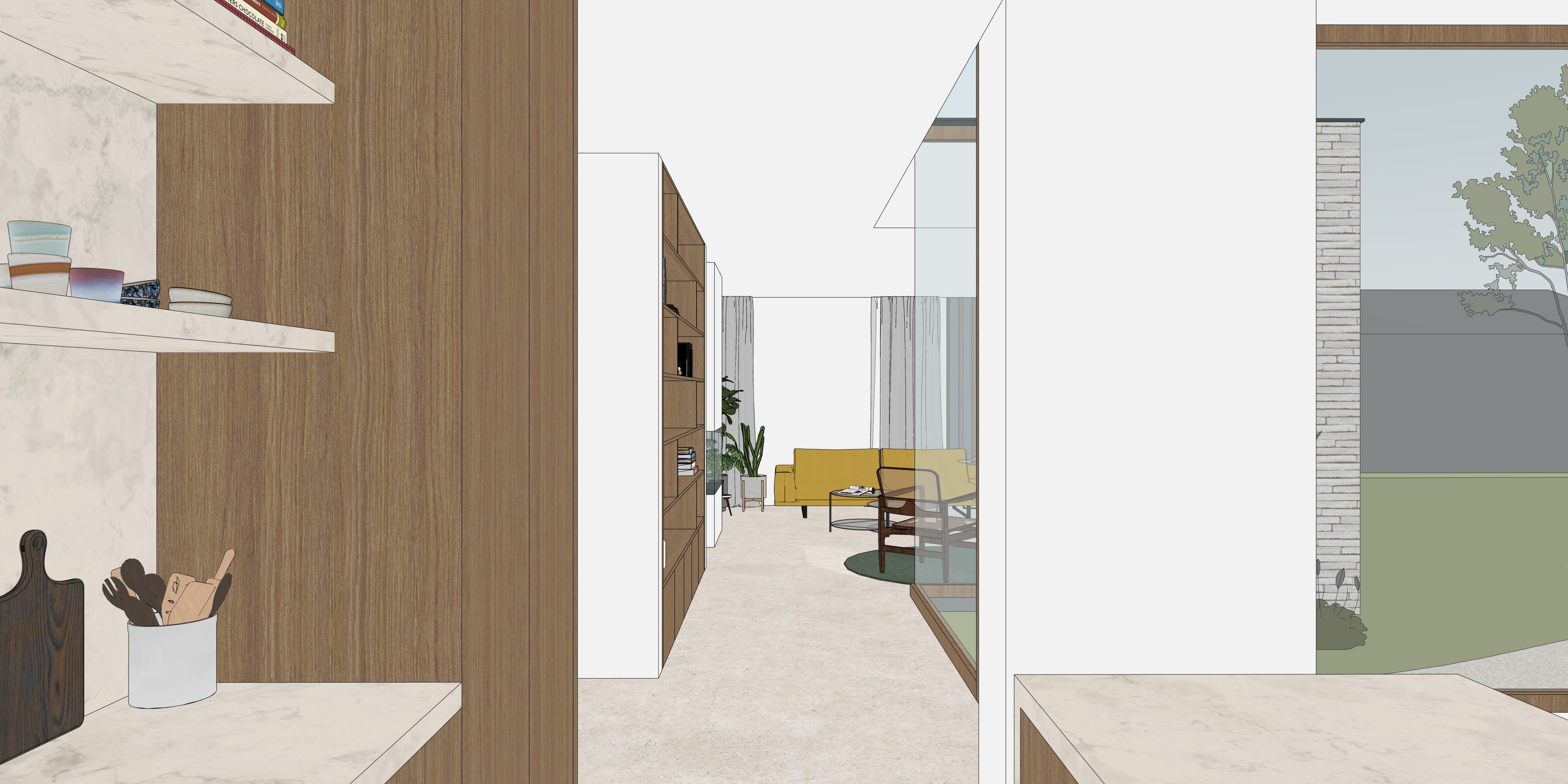 render a contemporary minimalist interior hallway with warm and inviting atmosphere use natural wood textures for shelves and panels and soft white marble for surfaces include a mustard yellow sofa and dark green accents for furniture the curtains are light gray creating a serene ambiance incorporate lush green plants adding a touch of nature the walls should be crisp white with large windows allowing natural light to flood the space highlighting the rich textures and creating a seamless indoor outdoor connection the floors are light beige for a cohesive and airy feel the overall mood is calm sophisticated and modern
