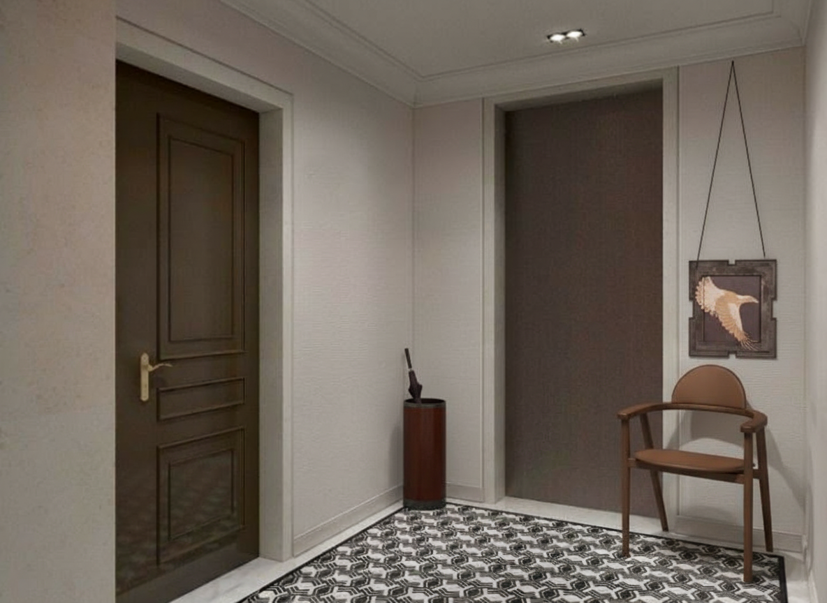 exterior shot interior shot photorealistic render of a entrance lift lobby design colours and floor pattern as is just place furniture inside rendering