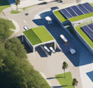 modern exterior shot canopy structure weighing station with green roof on top four lanes of traffic with middle medium dividing lanes into 2 and 2 trucks coming out and in to station architecture