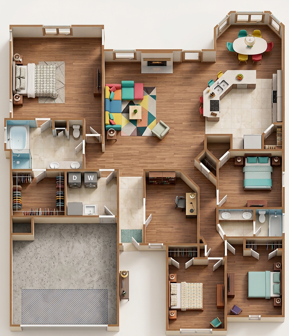 create photorealistic rendering of this stairway add 36 circular window with white trim clear glass at appx 15 centered in tall back wall going up stairs keep handrail light white oak floors light white oak and stair spindles champagne bronze metal posts keep spindle designs as is add eucalyptus trees and landscaping in windows keep white painted stair and floor stringer keep stairs light oak