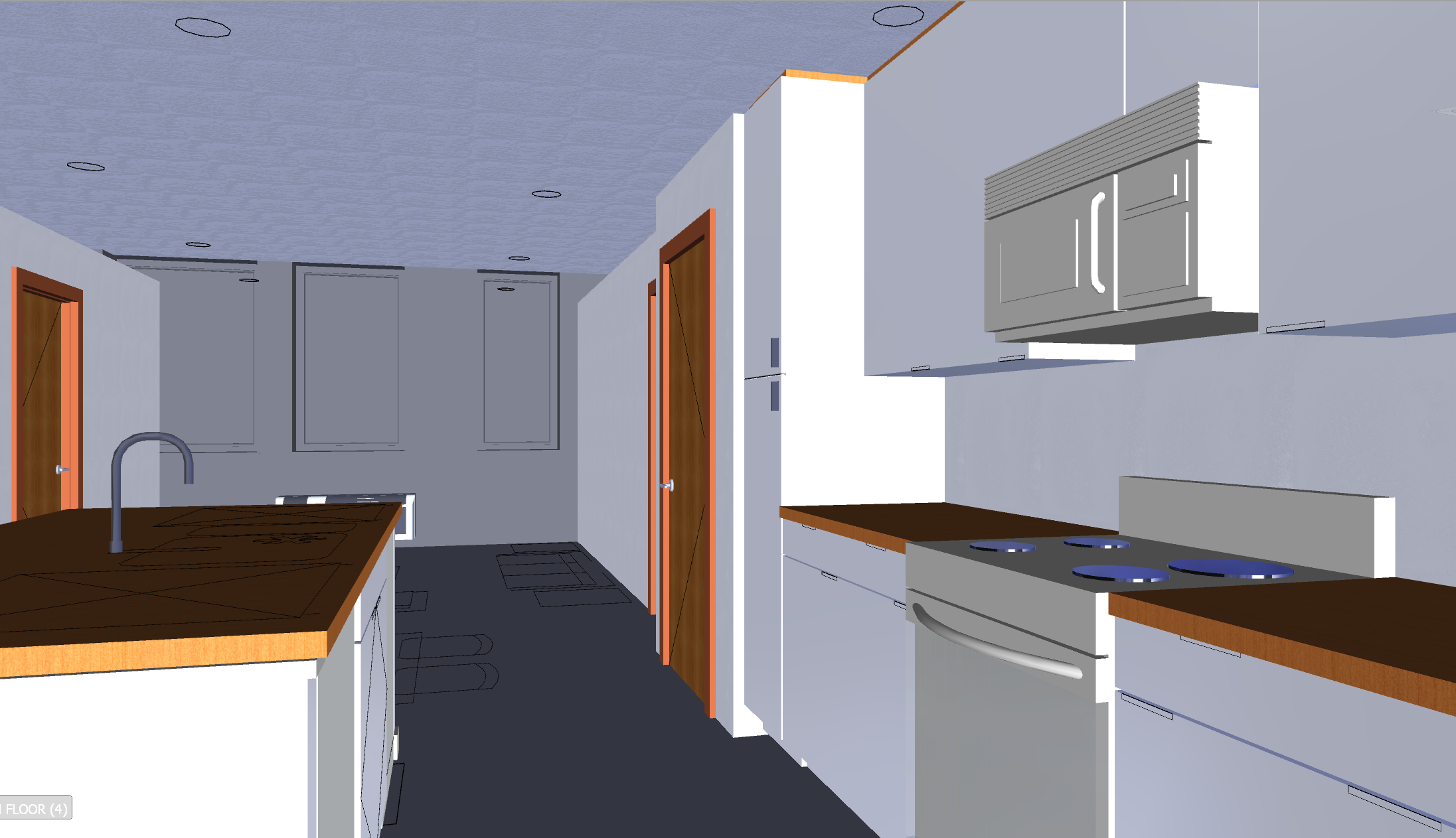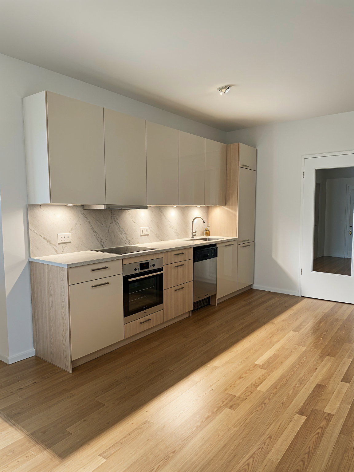 render a modern kitchen interior with a traditional design shaker style cabinets in soft gray with stainless steel handles countertops are quartz with a light grey vein providing an elevated look walls are painted a flat white and wall base is painted a glossy white doors and window frames are a glossy white the floor is a light oak wood plank adding brightness to the room appliances like the stove are a contemporary stainless steel recessed lighting in the ceiling emits a warm inviting glow the atmosphere is cozy yet modern combining elegance with functionality