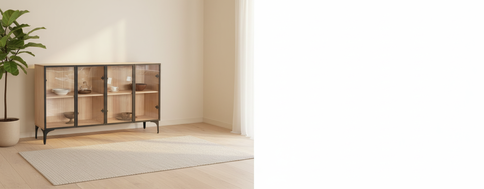 modernist exterior shot replace the current plain background with a warm cozy modern living room interior keep the display cabinet exactly the same do not change its design size color wood grain glass doors black metal frame legs angle or perspective the cabinet must remain in the exact same position on the left side of the image create a soft cozy interior background while leaving the right side mostly empty wall space to keep the composition minimal and spacious background details use a warm cream wall behind the cabinet the display cabinet stays on the left side of the image the right side remains mostly empty wall space to create balance and visual breathing room a tall indoor plant such as a fiddle leaf fig in a neutral ceramic pot placed near the cabinet add light oak wood flooring for warmth include soft natural daylight from the right side casting gentle warm light onto the cabinet to enhance the wood texture subtle cozy elements can be added near the cabinet only such as a small neutral rug or a faint wall shadow but keep the right side uncluttered architecture