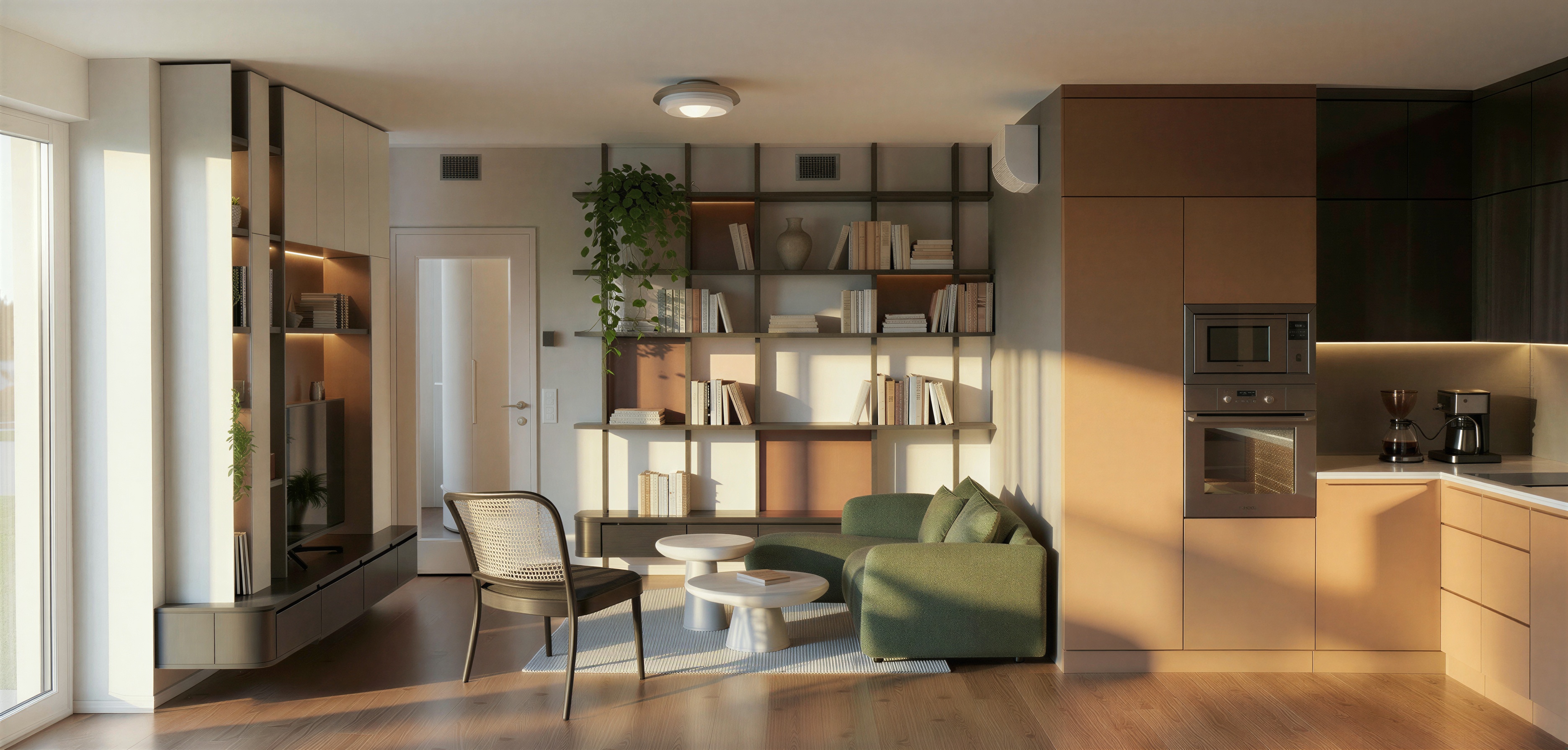change color of the kitchen tu sage green change color of the sofa to light grey