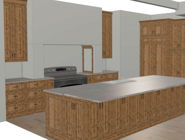 render this image change the countertop and full height back splash to taj mahal quartzite change the cabinet pull hardware and faucet to gold add under cabinet lighting