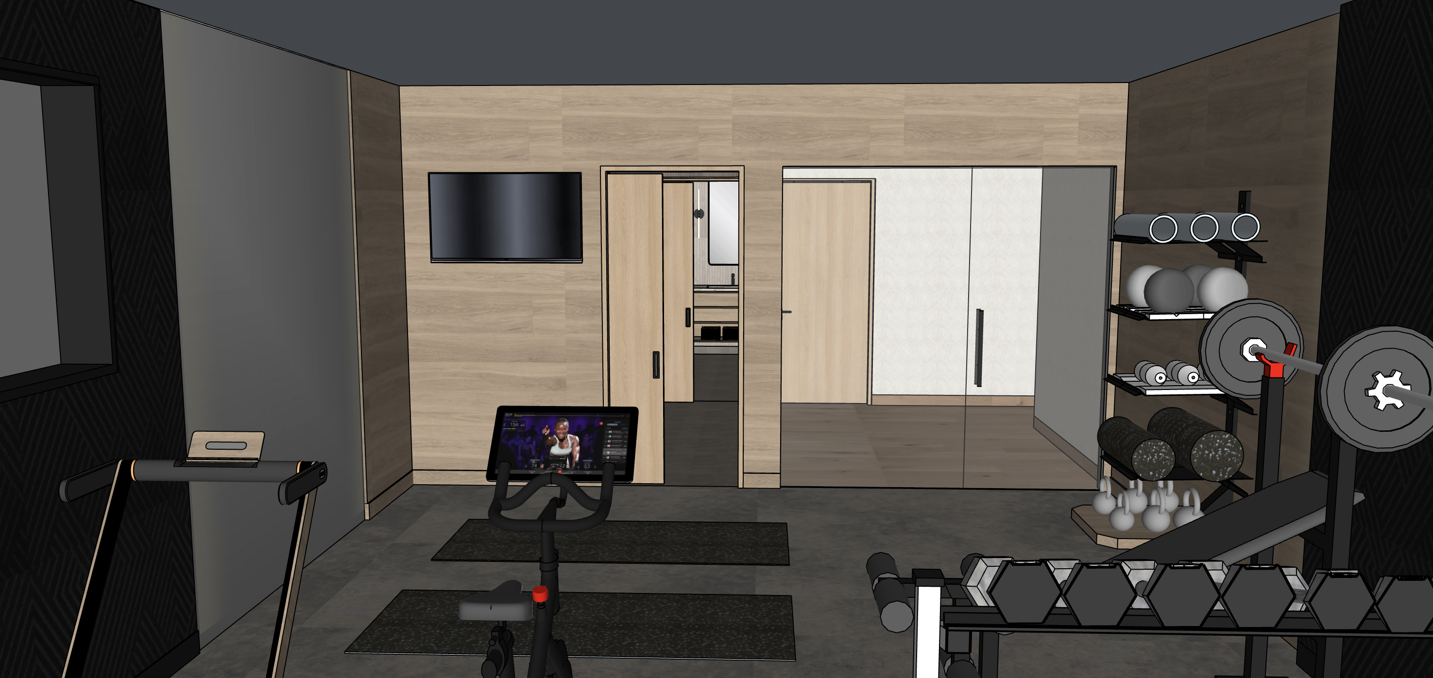 gym room keep back wall wood look wood is a lighter white oak gym floor is a concrete look black wall is a textured panel next to black wall is mirror linear light shines from black wall to wood