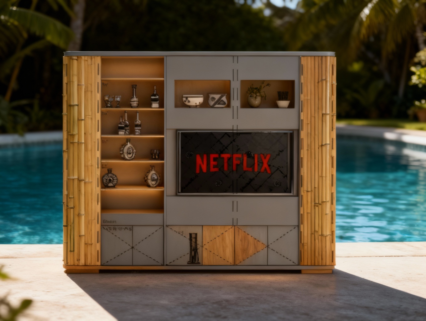 keep everything in the scene exactly the same same layout lighting materials and camera angle only change the front design of the bar counter add wooden arches with integrated soft lighting on the front side of the bar just like in the reference image the arches should have a warm mediterranean look elegant modern and natural do not move or change any other elements in the scene and keep the overall quality and atmosphere identical