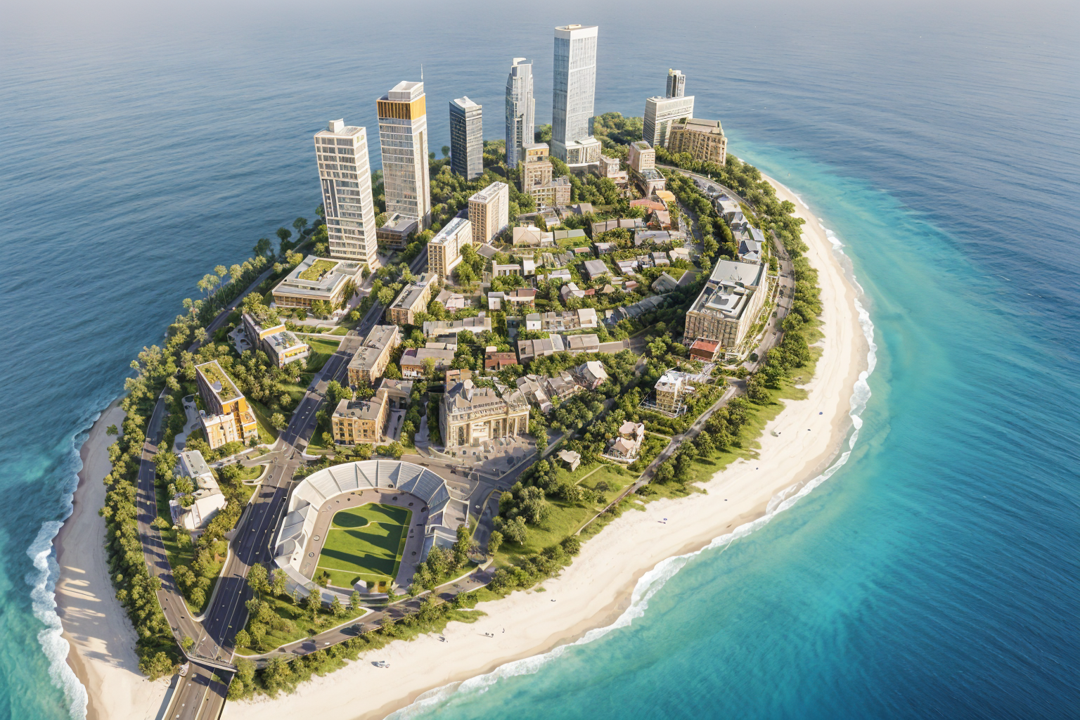 aerial shot highly realistic modern tropical island city use the existing volumes as buildings and add detailed architectural facades terraces balconies glazing shading screens and roof gardens include a mix of housing hotels retail and sports facilities surround the island edges with sandy beaches and lush tropical vegetation add abundant palm trees street furniture pedestrian paths lighting signage and people enjoying the environment use high quality materials realistic sunlight natural shadows and vibrant tropical colors render in ultra realistic style with detailed textures reflections and atmospheric depth