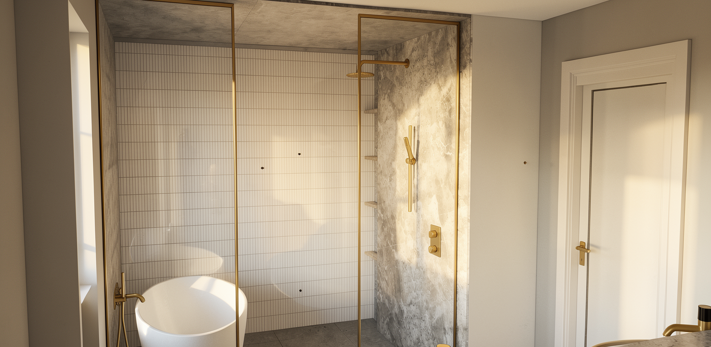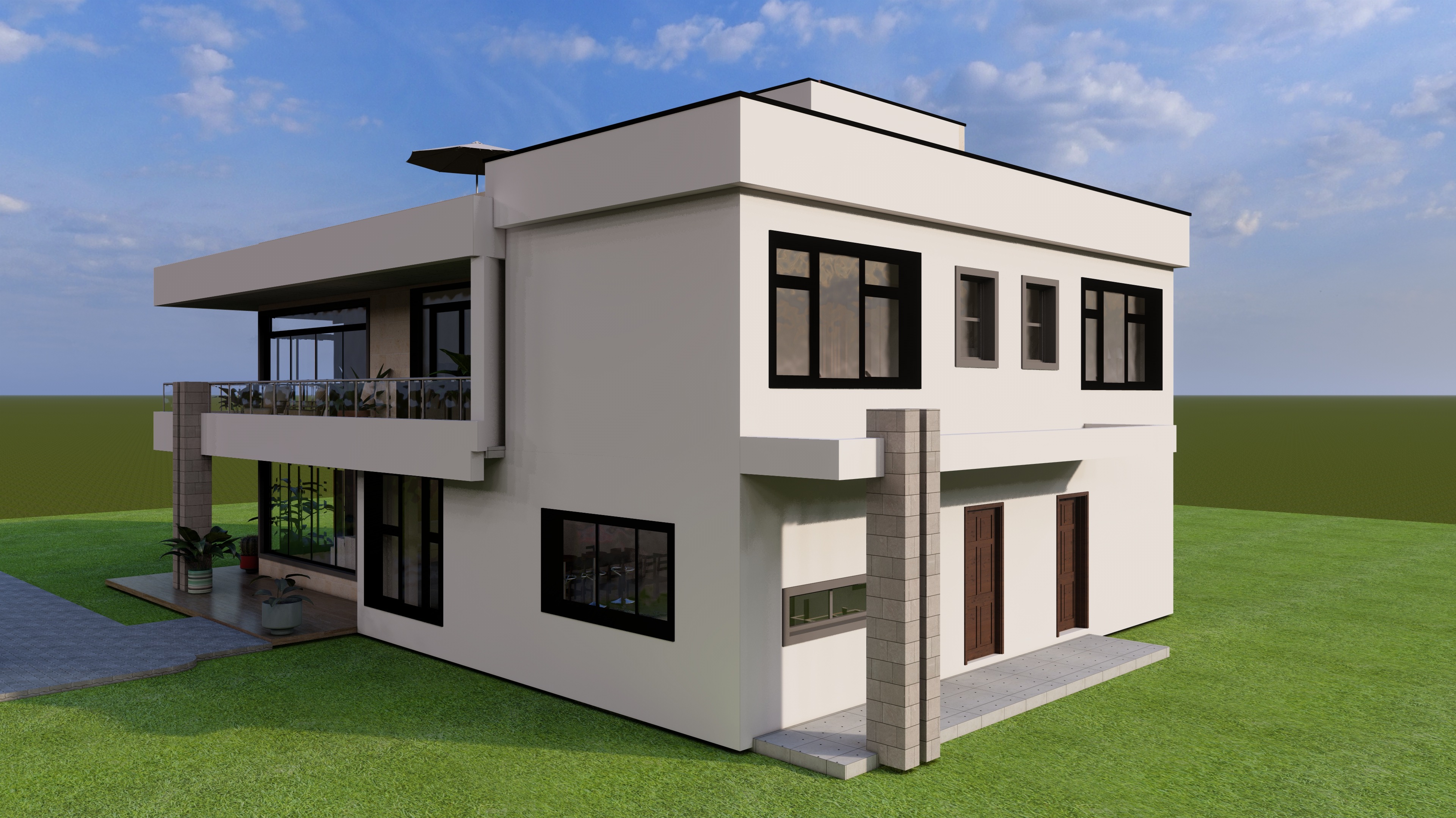 this is a model of a modern maisonette add few trees in background and neat vegetation to give it context add creamish interior warm lighting stick to all wall finishes as they are