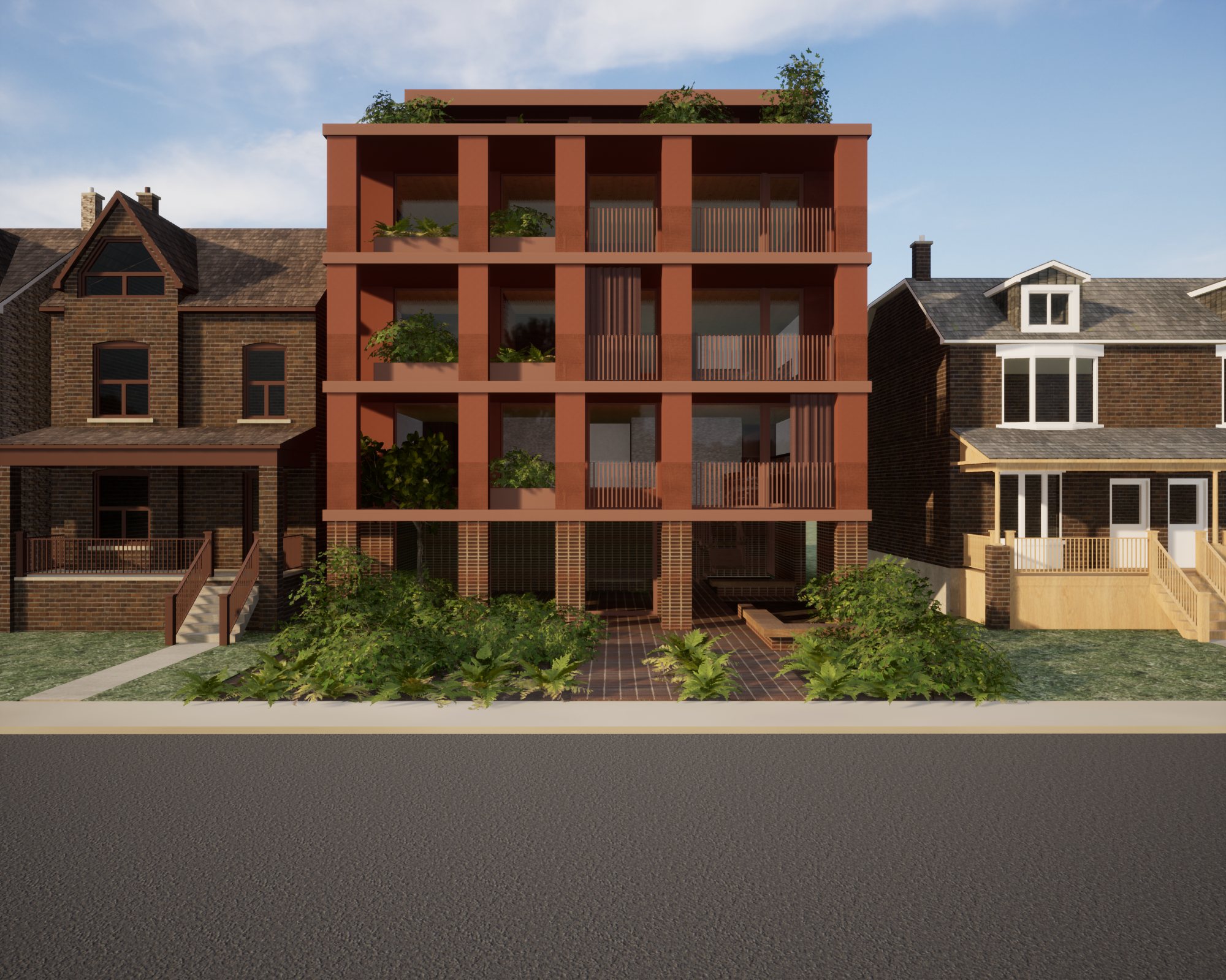 make more realistic add trees in background make public space in front of main building seating for a cafe cafe interior is only within the left three column bays while the right column bay is a recessed exterior entrance to the main building cafe and entrance must be at grade no steps up cafe patio should extend out to sidewalk but not spill onto it cafe should be minimalist like the blue bottle cafe in kyoto with wood paneling maintain proportions of street sidewalk etc this is set on a side street in toronto and should have local vegetation address is 120 westmoreland avenue please use neighbouring houses refer to reference image below for material palette https i pinimg com 1200x 2c 5a 62 2c5a6296ce7ead21766a92ca50e7fb0f jpg