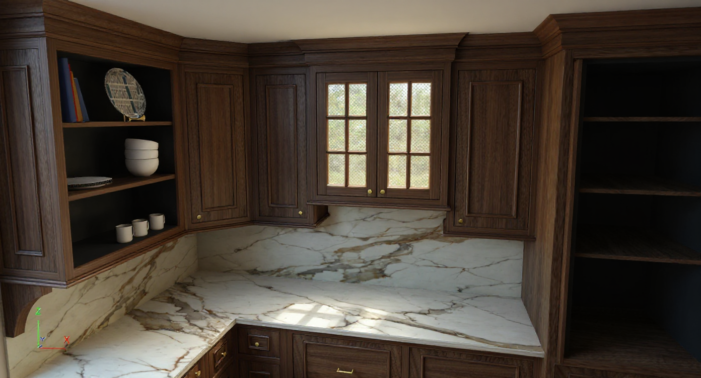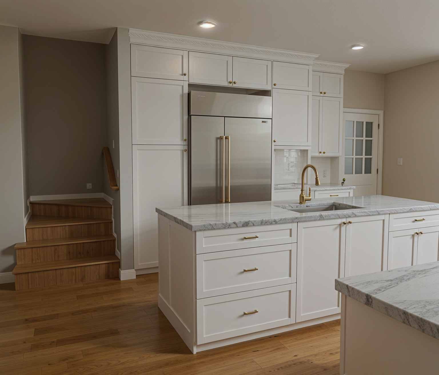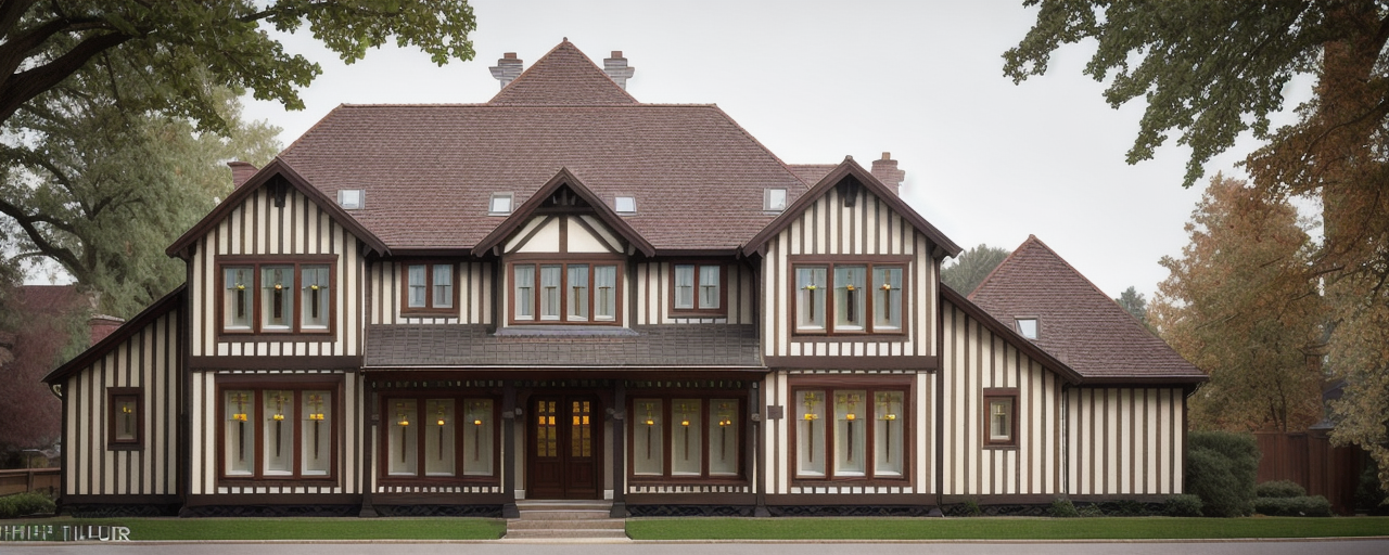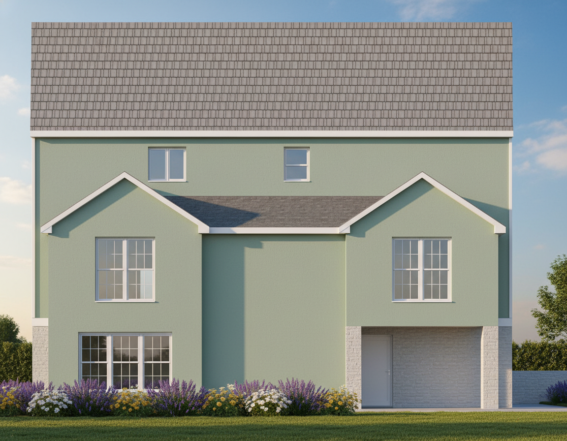 generate a beautiful rear elevation rendering of a two story house with a basement with a warm and inviting atmosphere the house features a modern design with a gable roof use soft pastel colors for the walls such as a gentle sage green and white trim for the edges and corners the roof should have a light grey tone with subtle shading to show depth the windows should have white frames and light reflecting glass set the scene during a serene golden hour with a partly cloudy sky casting a peaceful warm light across the house include a well maintained garden in front with lush green grass and colorful flowers like lavender and daisies to enhance the tranquil atmosphere