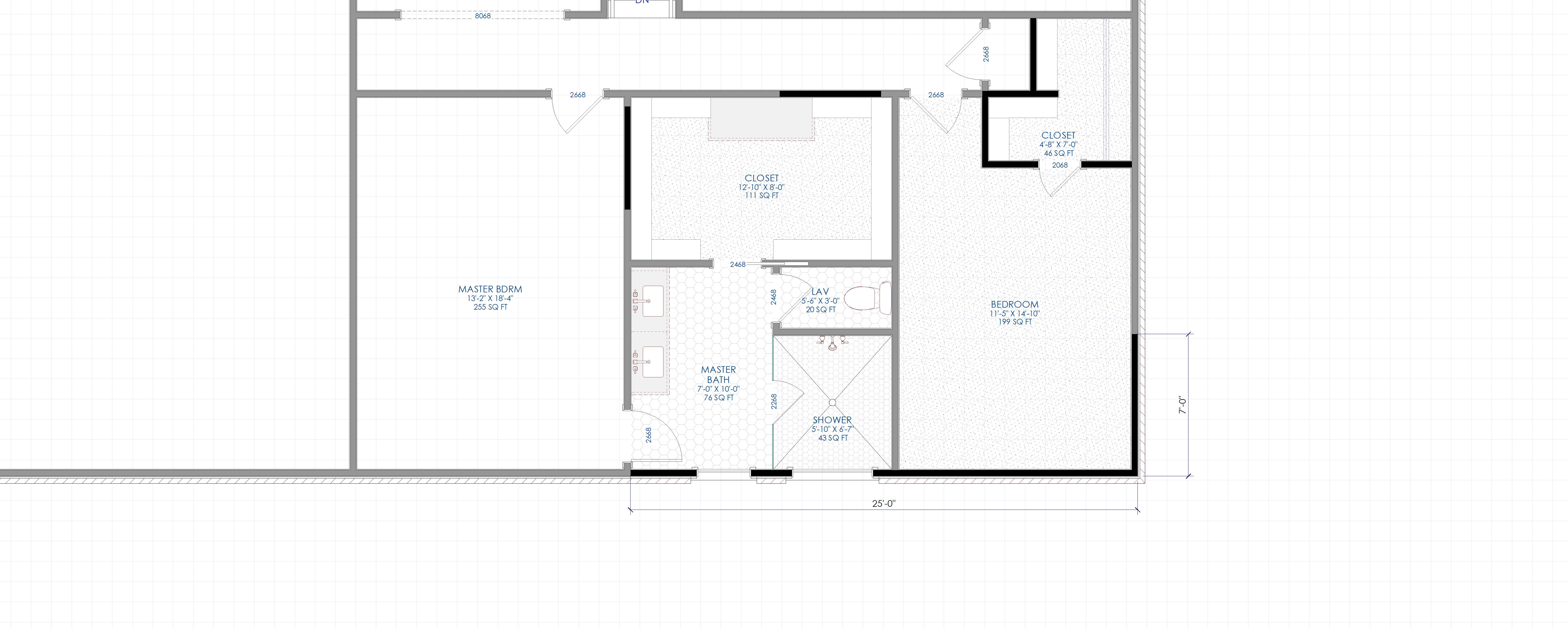 create a rendering looking from the bathroom door towards the shower using white marble tile floor white subway tile in shower with frameless glass enclosure with matte gold hardware double sink vanity with modern white oak cabinet and marble countertop with matte gold plumbing fixtures for sinks and shower led recess lighting in ceiling matte gold lights over each sink with lighted mirrors on wall above each sink carpet in closet show pocket door open to closet with white shelving inside