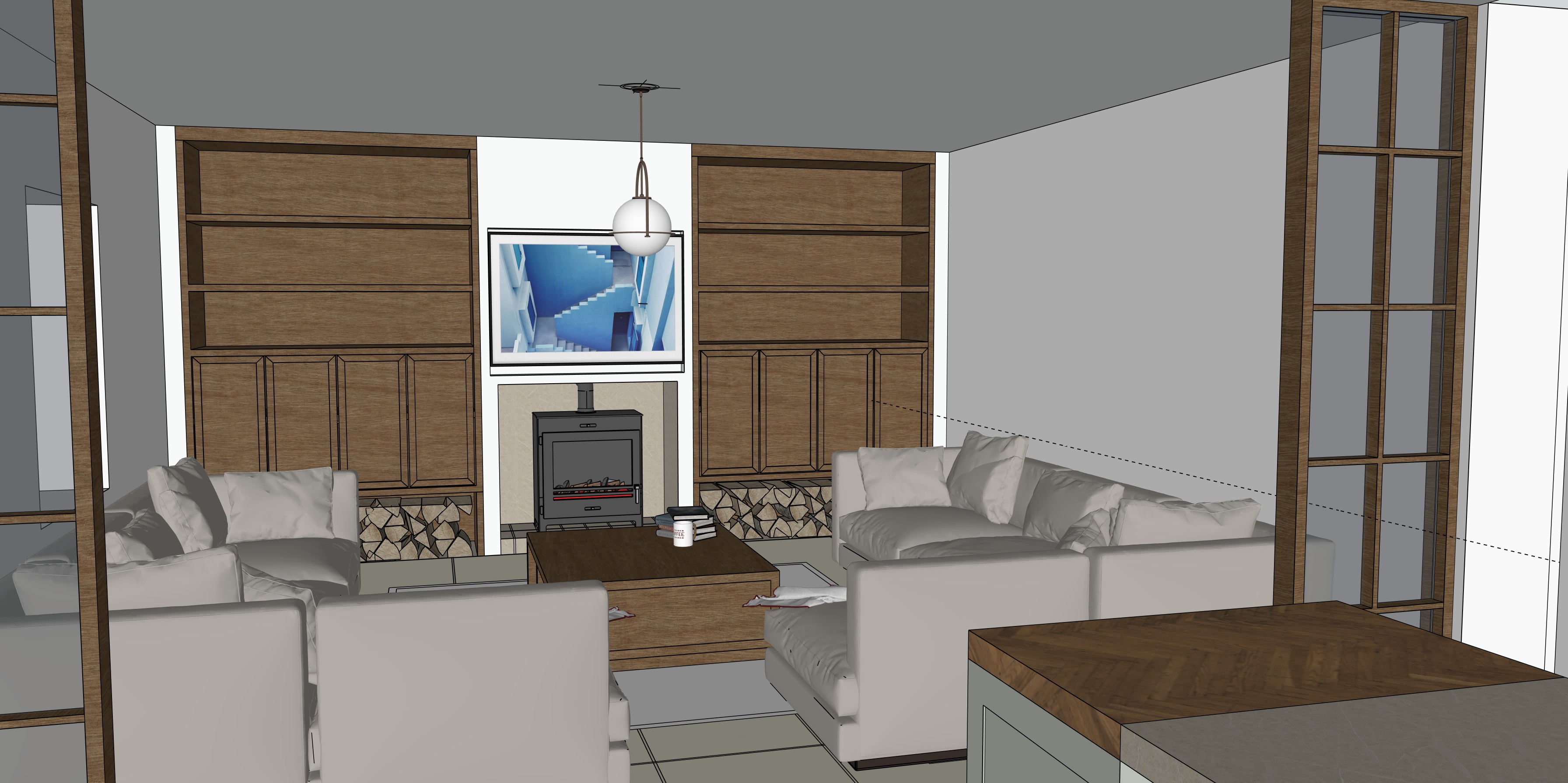 add framed coastal style art work to right hand wall only add books to bookcases add natural material style rug