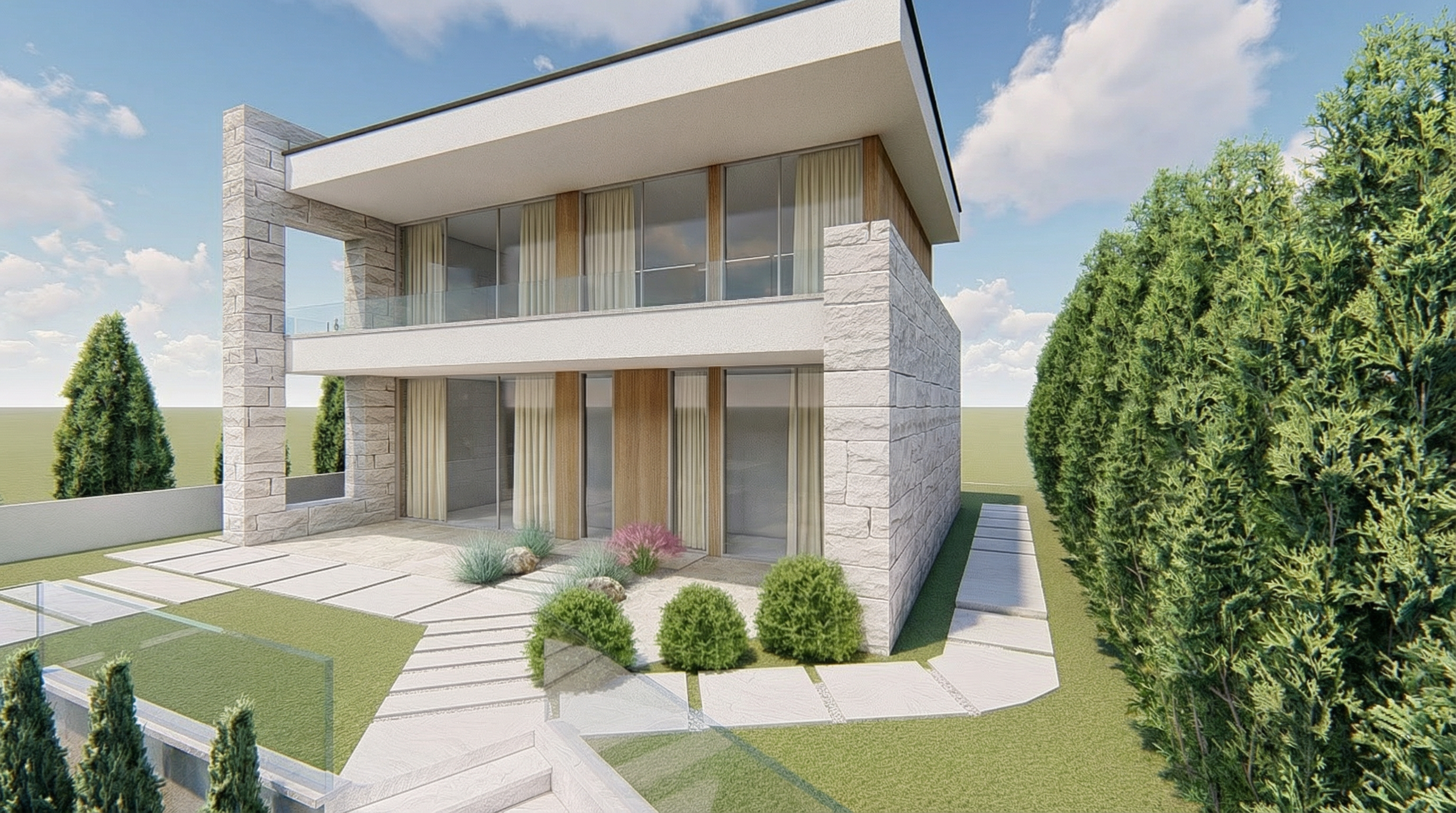 add some potted plants in front and parking spots