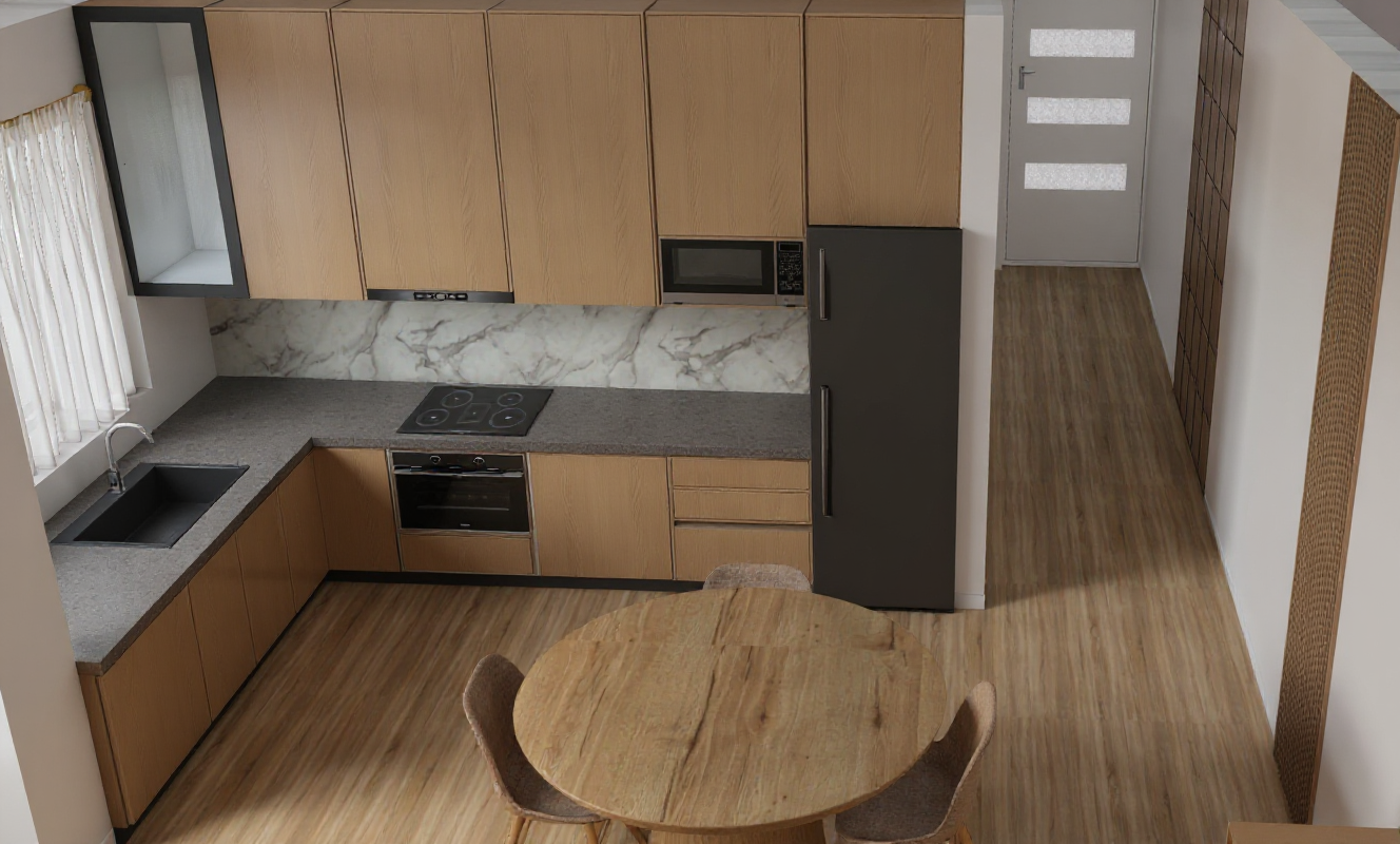 create a high resolution photo from this rendering with realistic textures and shadows from the light this needs to look and feel like a picture from a magazine cabinets white oak inset style doors and drawer faces matte black hardware calacatta elisio countertops and full height backsplash the cabinet doors and drawers to flat slab style doors inset do not remove anything from the imgae or crop the image keep the quality as is it now do not make cabinet doors and drawer faces into shaker style they must be flat slab fridge in stainless steel texture