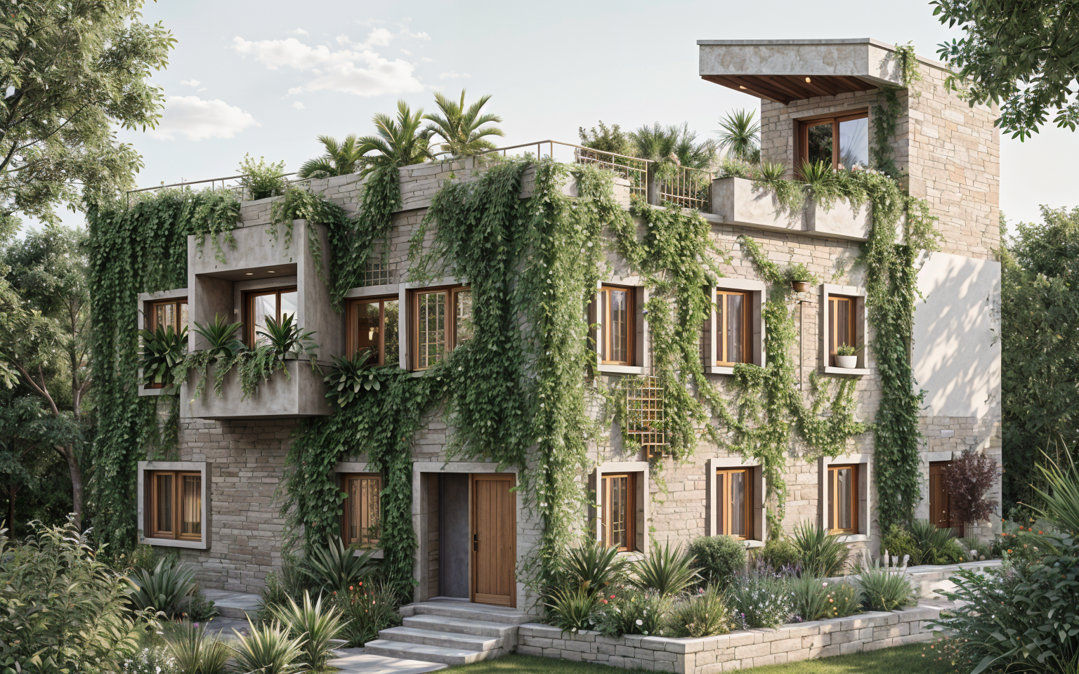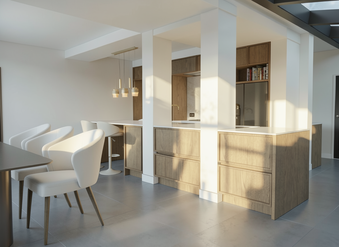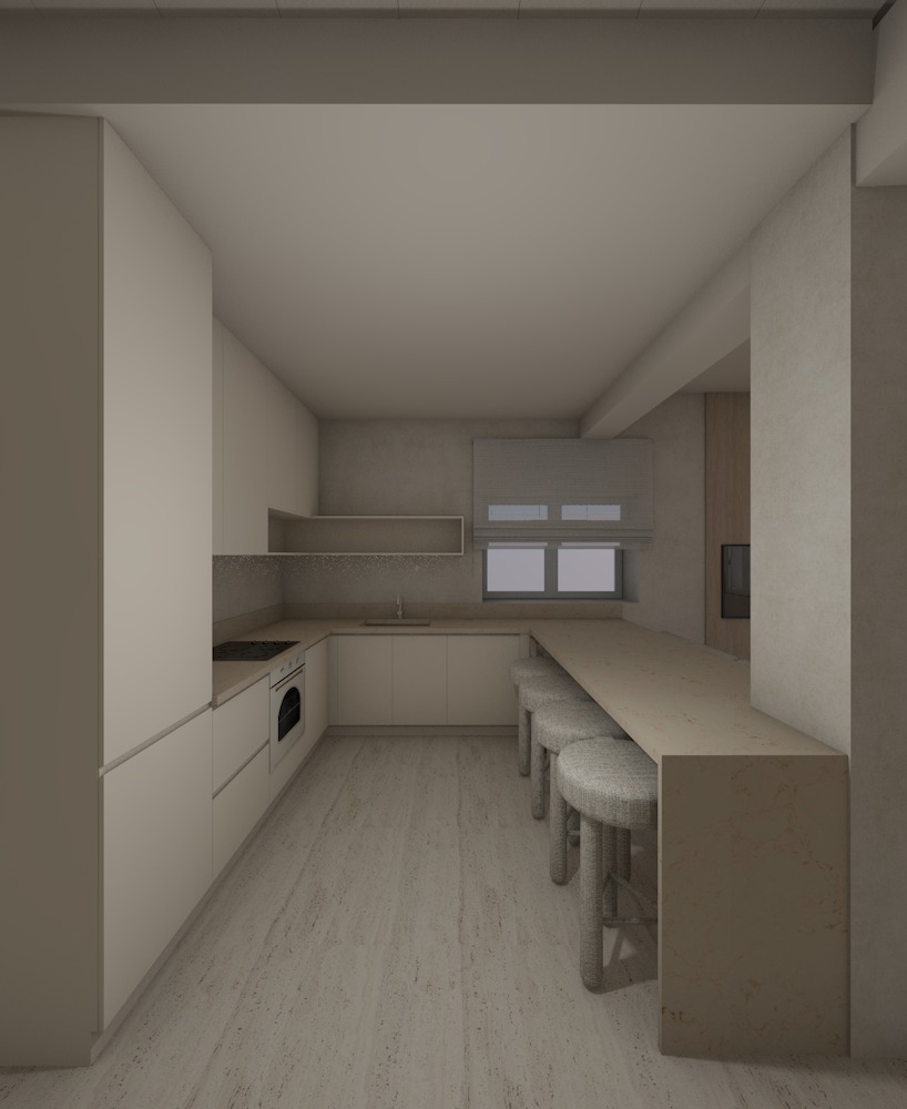 create a highly realistic render of a modern kitchen with a calm warm and refined atmosphere the design is minimal and cohesive with a soft neutral palette and natural materials that create an elegant and high end feel the kitchen layout is linear with an l shaped extension featuring clean handle less cabinetry in a light beige tone with a matte finish the surfaces appear smooth and seamless the countertop and backsplash are in a natural light beige stone with subtle texture and a soft matte appearance enhancing the organic aesthetic a hidden led strip is installed beneath the upper cabinets providing soft indirect lighting that gently illuminates the backsplash and countertop creating a warm and ambient glow in the foreground there is an extended kitchen island or bar with a solid monolithic appearance in the same light beige stone material in front of the island there are bar stools with light oak wooden legs and a natural finish the seats are upholstered in a soft light beige linen fabric with a subtle texture that enhances the natural and refined look at the back a window allows soft natural light to enter the space diffused by a light fabric roman shade in a neutral tone the walls are finished in a light beige microcement creating a seamless and soft background the flooring is in a light natural tone maintaining the calm and cohesive aesthetic the overall lighting is soft and balanced combining natural light with the hidden led lighting creating minimal shadows and a warm inviting and high end atmosphere ultra realistic render high resolution premium materials interior design magazine photography style