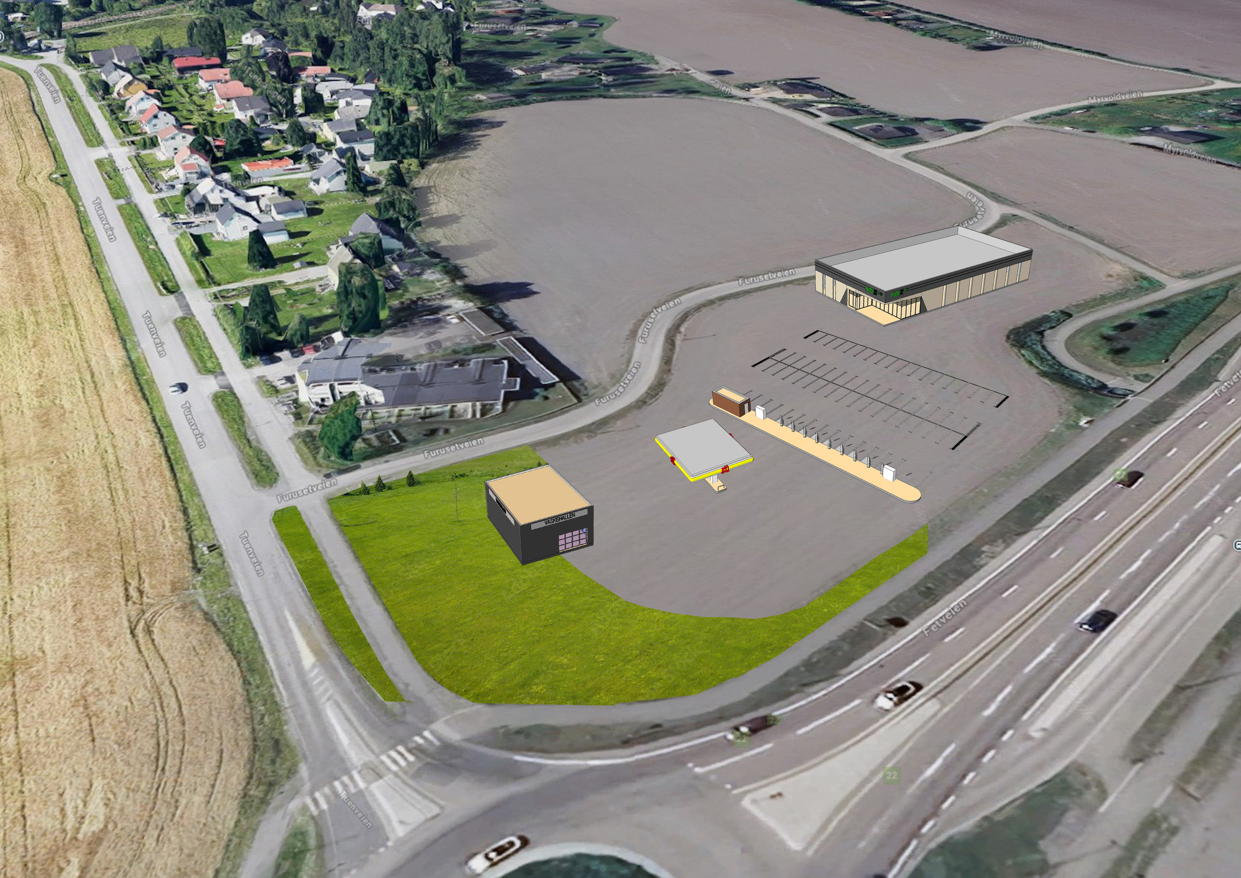 a parking lot in front of a store a gas station and a car wash add a few parked and moving cars and people instead of greenery add single small trees the weather is summery and sunny architecture