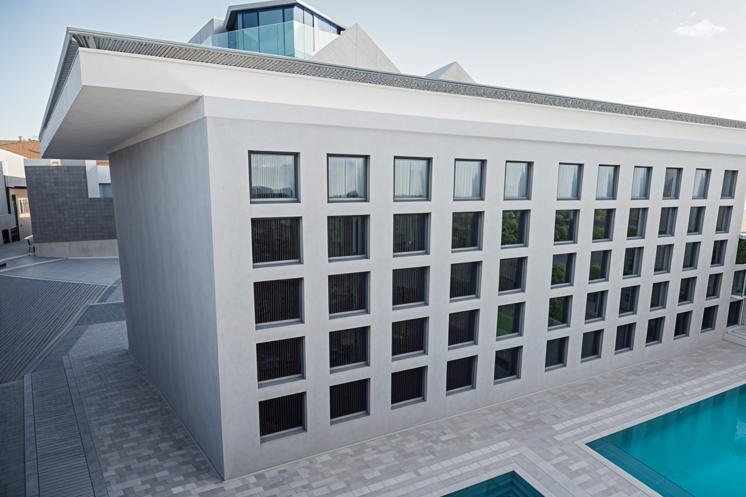 make it evening time sunset colors lights come out of the windows and balconys architecture